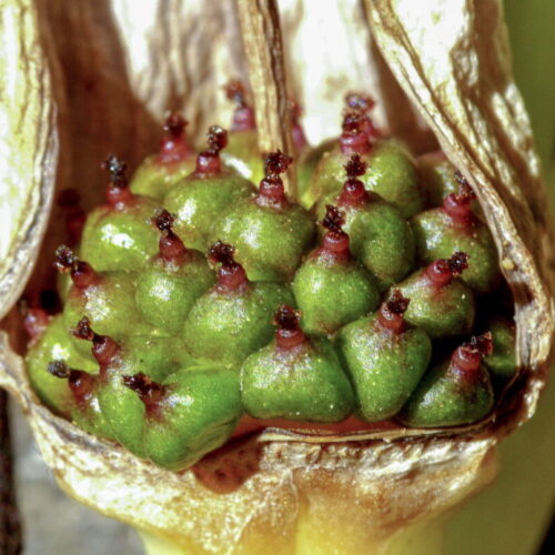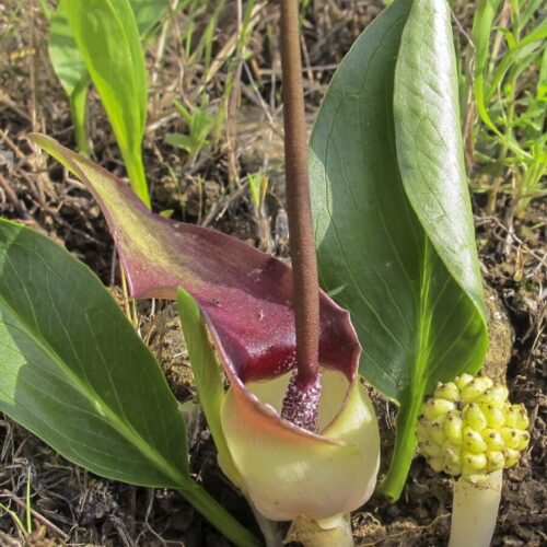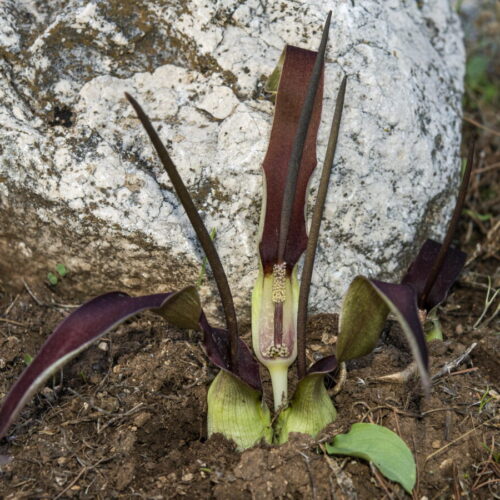 Acaule, glabra; tubérculo globoso, con profilos papiráceos. Hojas todas basales, pecioladas; limbo hasta 8 cm, oblongo–lanceolado o lanceolado. Inflorescencia con pedúnculo más corto que los pecíolos; espata 7–14 cm, abierta casi hasta la base; tubo globoso; lámina linear–lanceolada, de color púrpura por la cara interna y purpúreo–verdosa por la externa, blanquecina hacia la base. Espádice generalmente más corto que la espata, recto, no engrosado hacia el extremo, purpúreo, fétido, con flores unisexuales agrupadas en la mitad inferior, arriba las masculinas fértiles, más abajo un espacio desnudo y las femeninas fértiles en la base, a veces con flores femeninas estériles (pistilodios) dispersas entre las flores femeninas fértiles, todas muy reducidas, sin perianto, sésiles; estilos 0,4–0,7 mm. Infrutescencia hipogea, constituida por numerosas bayas piriformes, con tonalidades purpúreas en la madurez