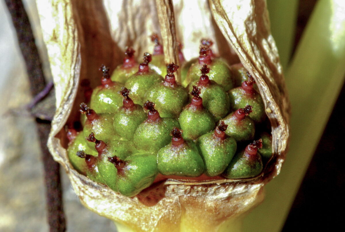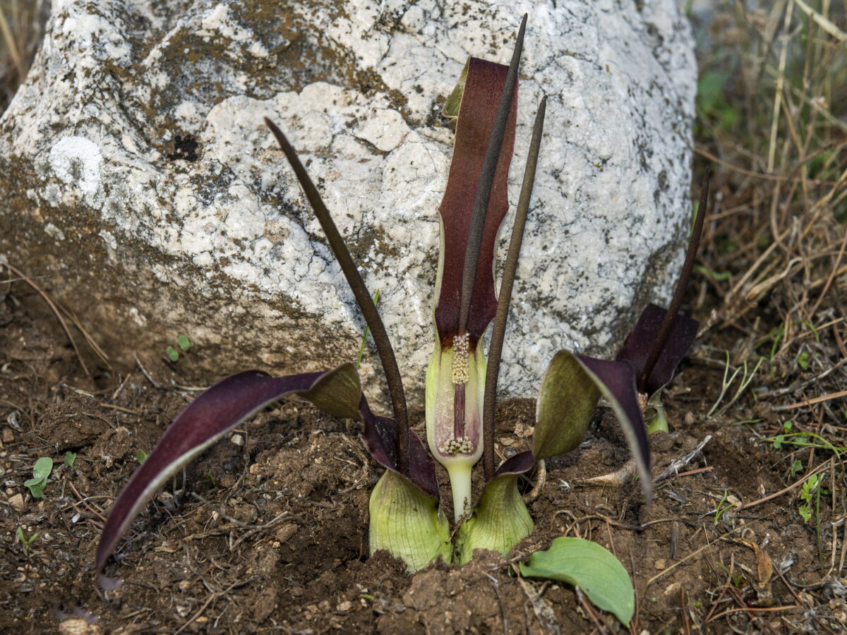 Acaule, glabra; tubérculo globoso, con profilos papiráceos. Hojas todas basales, pecioladas; limbo hasta 8 cm, oblongo–lanceolado o lanceolado. Inflorescencia con pedúnculo más corto que los pecíolos; espata 7–14 cm, abierta casi hasta la base; tubo globoso; lámina linear–lanceolada, de color púrpura por la cara interna y purpúreo–verdosa por la externa, blanquecina hacia la base. Espádice generalmente más corto que la espata, recto, no engrosado hacia el extremo, purpúreo, fétido, con flores unisexuales agrupadas en la mitad inferior, arriba las masculinas fértiles, más abajo un espacio desnudo y las femeninas fértiles en la base, a veces con flores femeninas estériles (pistilodios) dispersas entre las flores femeninas fértiles, todas muy reducidas, sin perianto, sésiles; estilos 0,4–0,7 mm. Infrutescencia hipogea, constituida por numerosas bayas piriformes, con tonalidades purpúreas en la madurez
