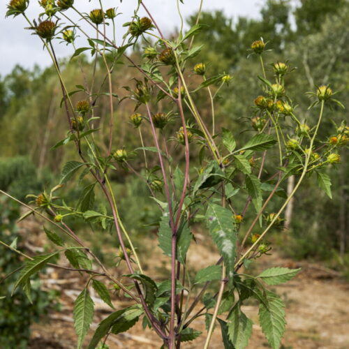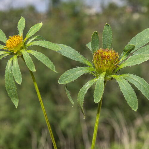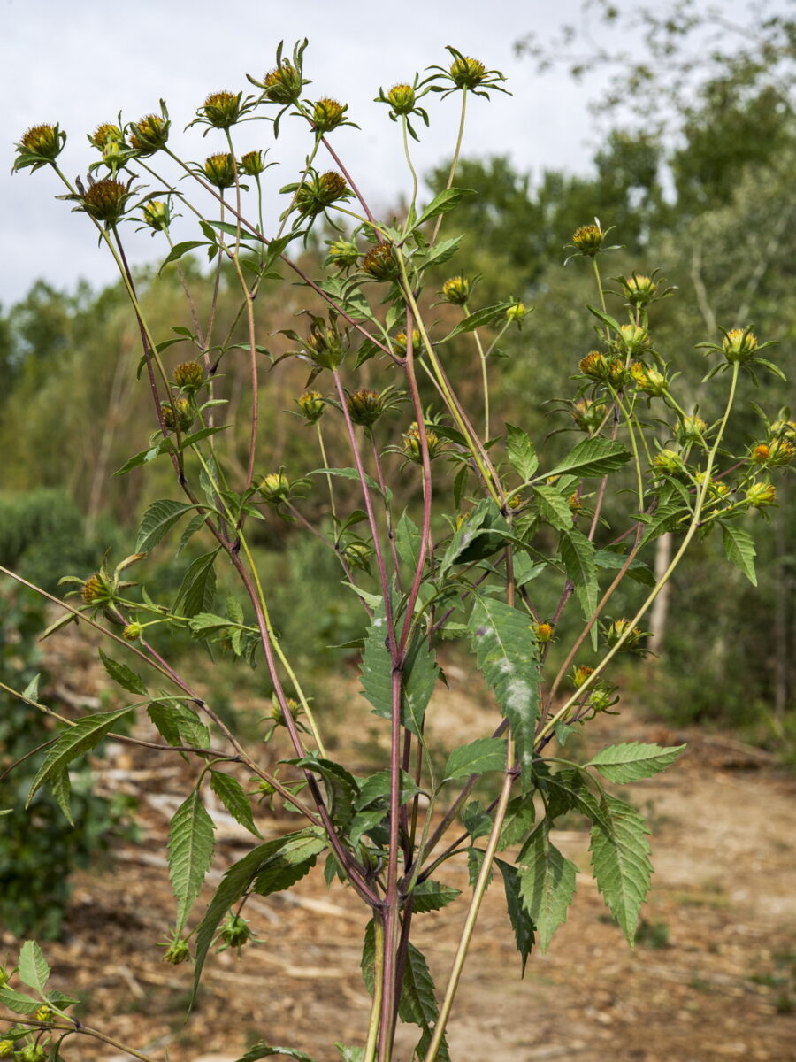 Anual, con pelos adpresos esparcidos. Tallos erectos, subcuadrangulares, ramificados. Hojas opuestas, las inferiores y medias 3(5)–folioladas; folíolos lanceolados u ovado–lanceolados, aserrados, los laterales peciolulados. Capítulos discoides, terminales, en cimas dicasiales; involucro con 2 filas de brácteas, las externas de 1,5–2,5 veces más largas que las internas, foliáceas, lineares, ciliadas, las internas ovadas u ovado–lanceoladas, con margen escarioso; receptáculo con brácteas interseminales. Flores flosculosas, amarillas, con nervios oscuros. Aquenios 4,5–7 mm, comprimidos, anchamente obovoideos, con una costilla en cada cara y pelos antrorsos en toda la superficie; vilano formado por 2 aristas de 2,5–3,5 mm, retrorso–híspidas