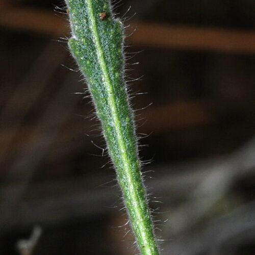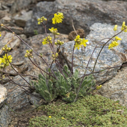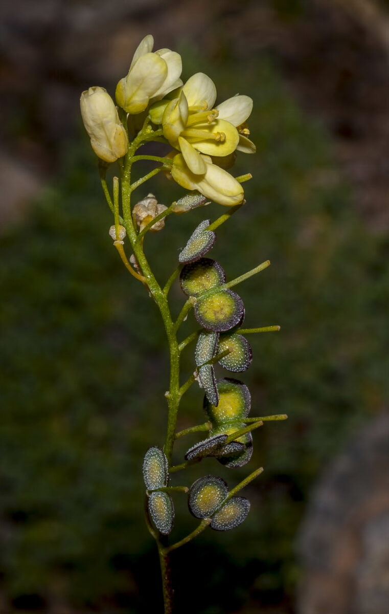 Cepa lignificada, con restos foliares. Tallos simples o poco ramosos en el tercio superior, densamente pelosos en la base, glabros arriba. Hojas 1–5(7) x 0,1–0,5(0,8) cm, en roseta basal delimitada y densa, lineares u oblanceoladas, enteras o con 1–4 dientes poco profundos cerca del ápice; las caulinares 1–3, de 0,3–0,9 x 0,1–0,2 cm, bracteiformes, lineares, sésiles; todas hirsutas, pestañosas, con pelos largos en los márgenes y nervio central, mezclados con otros más cortos, aterciopelados. Inflorescencia ebracteada, simple o poco ramosa; racimos densos y alargados en la fructificación, unilaterales, con la mayoría de los frutos hacia un lado. Flores actinomorfas, hermafroditas, tetrámeras; sépalos 1,2–2,5 mm, amarillentos, glabros, apenas gibosos; pétalos 2,5–4 mm, auriculados en la base y con uña muy corta, amarillos; estambres 6, tetradínamos, con filamentos filiformes; ovario súpero, con 1 primordio por lóculo. Frutos en silícula angustisepta, de 2–4(5) x 4–6(7) mm, planos, dídimos; valvas suborbiculares o elípticas, con el margen plano y brevemente alado, glabras o con pelos mazudos en el disco, con las semillas prominentes; pedicelos 3–6 mm, erecto–patentes, unilaterales, glabros; estilo 2–3 mm. 2n = 18