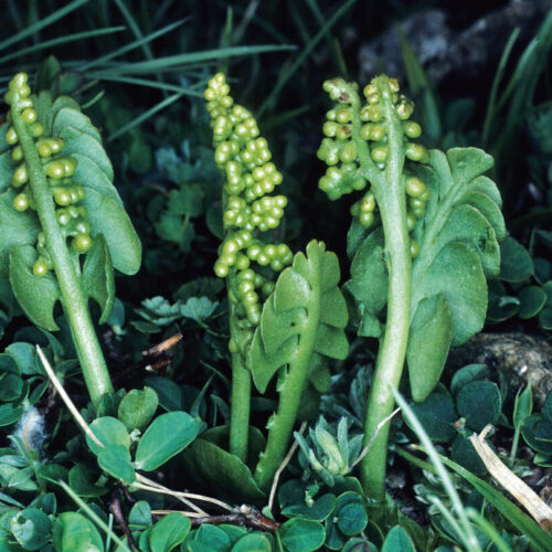 Fronde solitaria, peciolada, con vaina basal de color castaño y dos segmentos, uno estéril foliáceo y otro fértil ramificado; lámina del segmento estéril de 0,5–10 cm, subsésil, verde–amarillenta, pinnatisecta, con 3–9 pares de pinnas subopuestas, flabeladas, enteras a crenadas; segmento ramificado de la parte fértil de 2–6 cm, peciolado, ramas con euesporangios castaño–amarillentos. Esporas de 30–40 µm