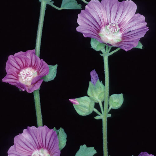 Tallos erectos, ramificados, con abundante tomento constituido por pelos estrellados o fasciculados de radios ± largos y pelos simples capitado–glandulíferos. Hojas 2–6(7) x 2–5(8) cm, suborbiculares o cordadas, crenado–dentadas, las inferiores largamente pecioladas, todas densamente tomentosas, amarillentas; estípulas anchas, subamplexicaules, caducas. Flores (1)2–4(5) en fascículos axilares, sobre pedúnculos más cortos que el pecíolo de la hoja axilante, actinomorfas, hermafroditas, pentámeras; piezas del epicáliz 3, anchamente ovadas, soldadas en el 1/3–1/2 basal, de obtusas a subagudas; sépalos ovados, agudos o acuminados, conniventes, acrescentes en la fructificación; pétalos 20–40 mm, obovados, truncados o ligeramente emarginados, con uña muy pelosa, purpúreos. Fruto en esquizocarpo discoideo; mericarpos de dorso redondeado, pelosos o glabros; carpóforo que sobrepasa a los mericarpos sin recubrirlos