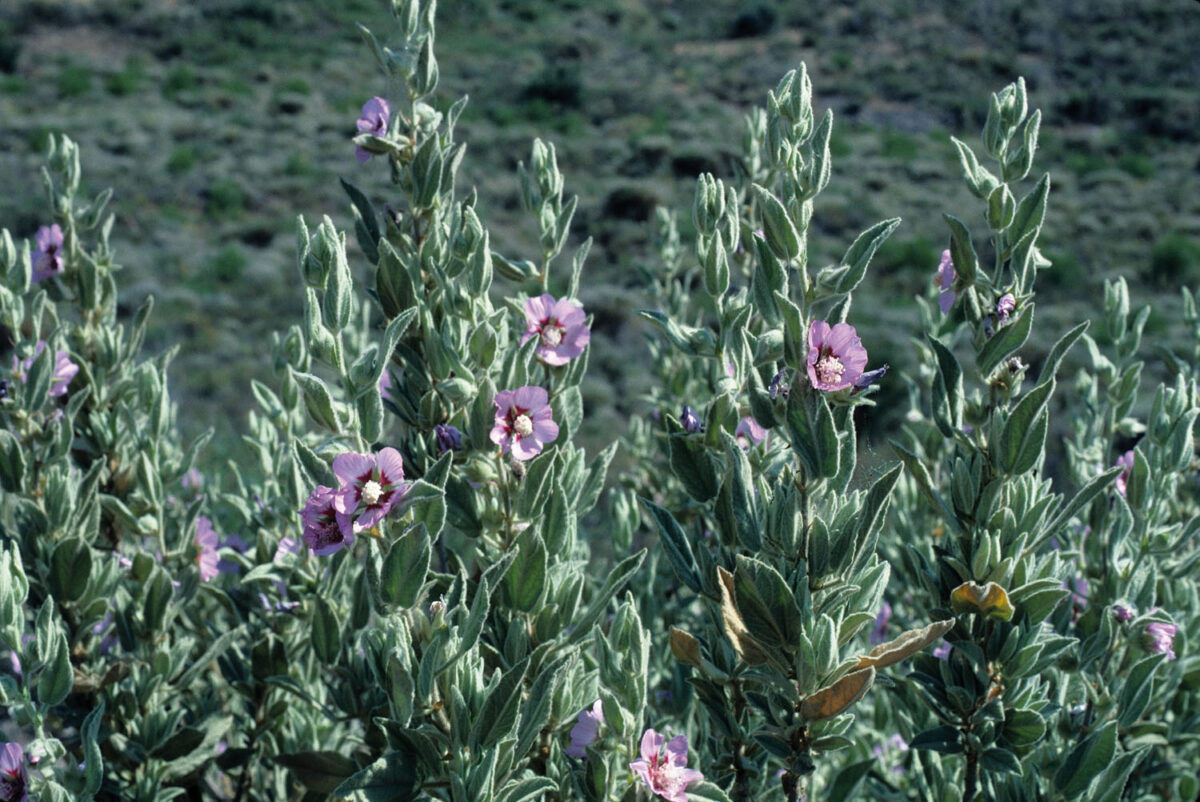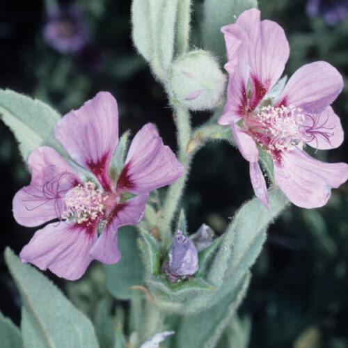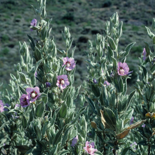 Arbusto con tallos erectos, foliosos; indumento denso y floccoso, de pelos estrellados, blanco–amarillento. Hojas 3–7 x 2–3,5 cm, ovado–lanceoladas, ovado–oblongas u ovadas, cordadas o redondeadas en la base, ligeramente crenadas, con nerviación marcada en el envés, cortamente pecioladas, blanco–tomentosas; estípulas triangulares, pardas, caducas. Flores actinomorfas, hermafroditas, pentámeras, solitarias, axilares, sobre pedúnculos más cortos que la hoja axilante; piezas del epicáliz 3, anchamente triangulares, obtusas, soldadas hasta la mitad, más cortas que los sépalos; sépalos lanceolados, agudos, erectos, no acrescentes en la fructificación; pétalos 15–25 mm, obovados, obcordados, rosados, manchados de púrpura en la base. Fruto en esquizocarpo discoideo; mericarpos de dorso redondeado, con las caras laterales lisas, amarillentos, glabrescentes; carpóforo que sobrepasa a los mericarpos sin recubrirlos