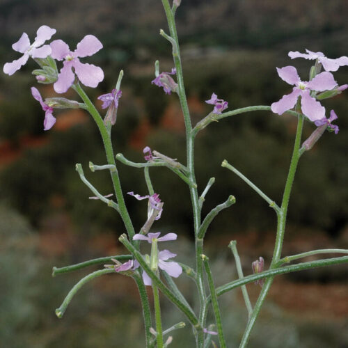 Indumento laxo de pelos ramificados cortos y frecuentemente glándulas estipitadas. Tallos ± erectos, ramificados desde la base. Hojas alternas, las basales de 20–90 x 4–20 mm, oblanceoladas, enteras, sinuadas, denticuladas o pinnatífidas, cuneadas en la base, obtusas; las caulinares más pequeñas. Racimos ebracteados, laxos, multifloros. Flores actinomorfas, hermafroditas, tetrámeras; sépalos 8–9 mm, los laterales gibosos en la base, soldados en la parte superior, de verdosos a purpúreos; pétalos unguiculados, con uña de c. 9 mm y limbo de 7–11 x 4–6 mm, patente, oblongo–obovado u obcordado, ligeramente emarginado, rosado o lilacino, blanquecino en la base; estambres 6, tetradínamos. Frutos en silicua, de 30–70 x 1–2 mm, lineares, de sección circular, erecto–patentes o patentes, torulosos; apéndice estigmático con 2 cuernos laterales de 1,5–3 mm, incurvados, rara vez rectos, erecto–patentes, mucho más largos que la porción estigmática central. Semillas 1,5–2 mm, uniseriadas, con ala estrecha