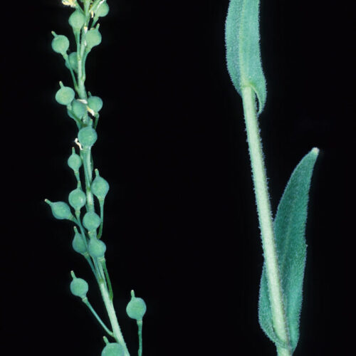 Anual, pubescente sobre todo en la parte inferior, con pelos ramificados. Tallos erectos, simples o poco ramificados. Hojas alternas, enteras, agudas; las basales 5–13 x 1–2,5 cm, pecioladas, oblongo–lanceoladas, generalmente marchitas en la madurez; las caulinares 1–5 x 0,2–1 cm, sésiles, sagitadas. Racimos ebracteados, multifloros, dispuestos en panícula. Flores actinomorfas, hermafroditas, tetrámeras. Sépalos 2–3 mm, suberectos, con pelos simples o algunos ramificados; pétalos 3,5–4 x c. 1 mm, unguiculados, oblongo–obovados, enteros, amarillos; estambres 6, tetradínamos. Frutos en silícula latisepta, de 3–2,5 x 2,5–2 mm, monospermos, indehiscentes, globosos o subglobosos, apiculados, reticulado–rugosos, con 4 nervios marcados en la parte basal, glabros. Semilla lisa, amarillenta
