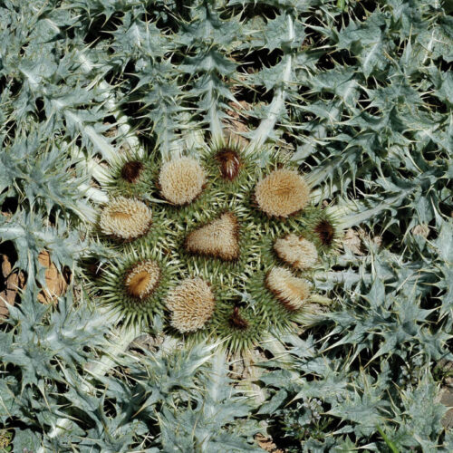 Acaule, blanco–grisácea. Hojas en roseta basal, de elípticas a lanceoladas, de pinnatisectas a dentado–pinnatífidas, espinosas, aracnoideas, con indumento oculto de glándulas globulares y pelos pluricelulares. Capítulos 1–12, sésiles, aglomerados, ± globosos; involucro 2,5–6 x 2–7 cm, con numerosas filas de brácteas imbricadas, espinosas, todas erectas o bien las externas y medias patentes o reflejas, subcoriáceas, no aracnoideas, las externas de 6–20 x 2–5(6,5) mm, lanceolado–subuladas, glabras, de margen escábrido, las medias de 11–23 x 3–5,2 mm, semejantes a las externas; receptáculo glabro, foveolado. Flores flosculosas, blancas, rara vez rosadas; corola 17–27 mm, eglandulosa, con limbo de longitud < que la del tubo. Aquenios 3,2–5 mm, obovoideos; vilano (13)16–30 mm, subplumoso, blanquecino