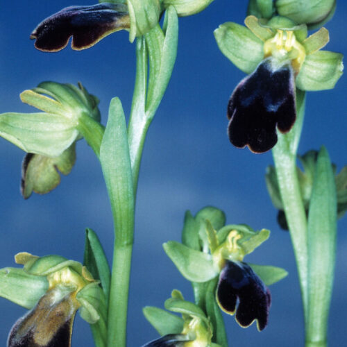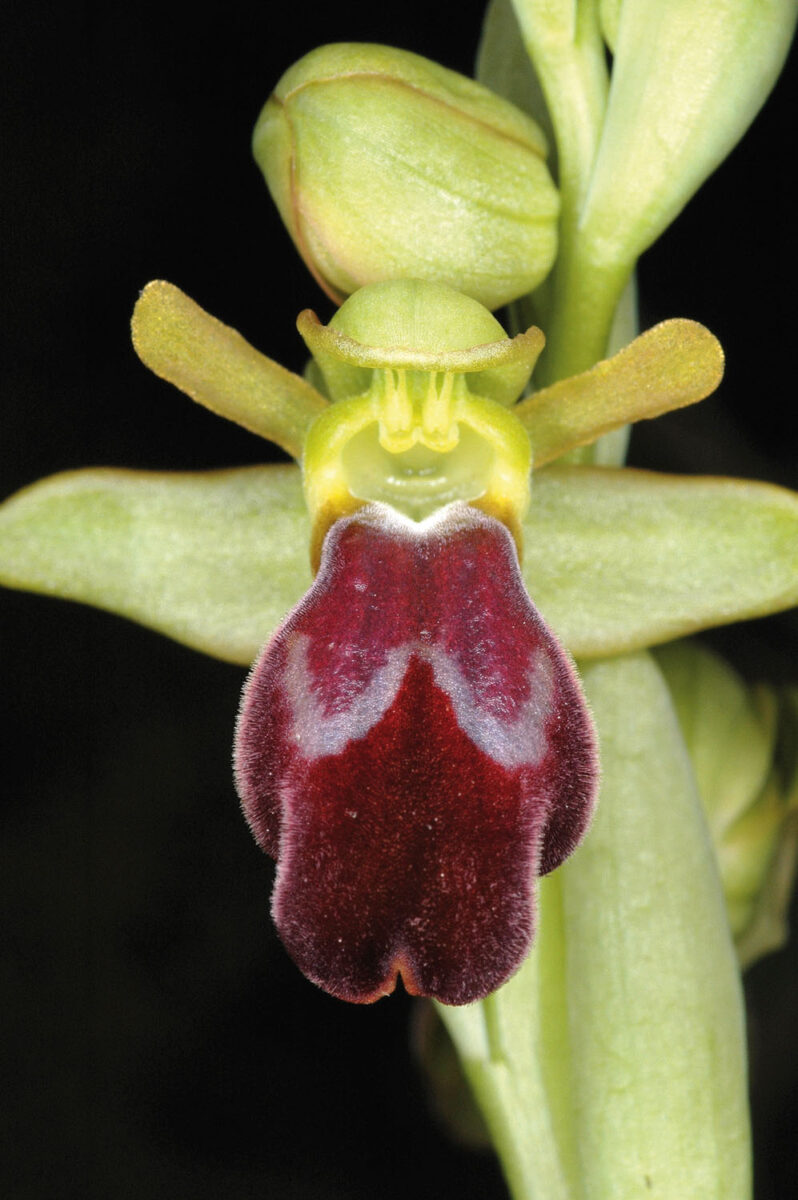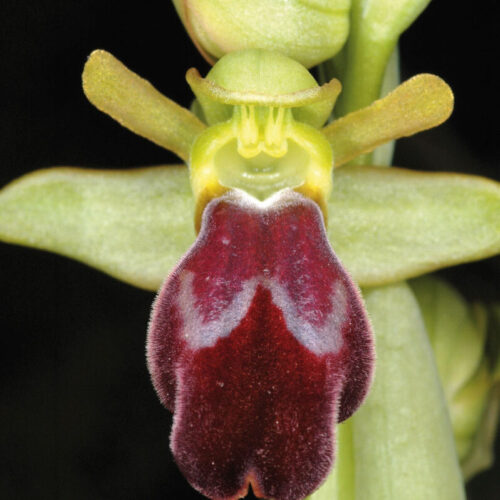 Tubérculos 2(3), subglobosos, sésiles. Hojas basales 4–10 cm, ovado–lanceoladas u oblongo–lanceoladas. Inflorescencia laxa; brácteas inferiores más largas que el ovario, oblongo–lanceoladas, de color verde claro o verde amarillento. Sépalos laterales libres, cóncavos, de color verde amarillento o verde blanquecino. Pétalos laterales 7–11 mm, patentes, oblongo–lineares, de color verde amarillento o pardo verdoso. Labelo 11–19 mm, más largo que ancho, con anchura máxima inferior al doble de la parte más estrecha, trilobulado, con lóbulos laterales situados hacia la mitad y lóbulo central emarginado y sin apéndice carnoso terminal, algo convexo, velutino, negruzco, pardo violáceo o pardo oscuro, ocasionalmente con tonos púrpura, a veces con reborde marginal amarillo de menos de 0,7 mm de anchura, con una acanaladura en forma de V en la base; mácula bipartida, poco brillante, generalmente glabra, con el borde apical de color gris–azulado. Ginostemo obtuso, sin apículo. Fruto cápsula, erecto