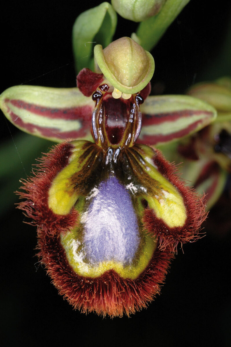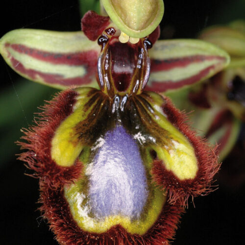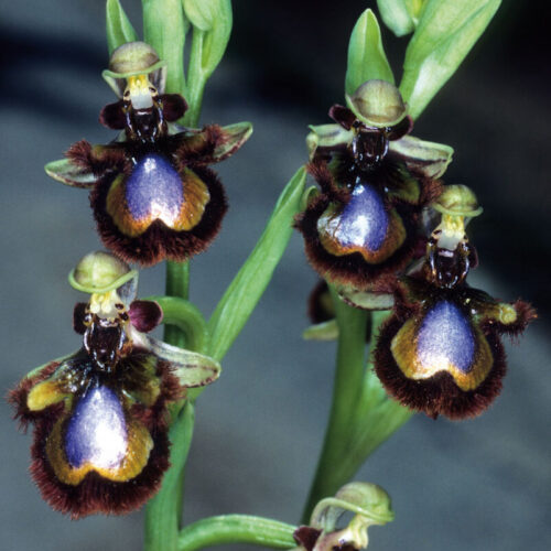 Tubérculos 2(3), subglobosos, sésiles o subsésiles. Hojas basales 3,3–7 cm, ovado–lanceoladas. Inflorescencia laxa; brácteas inferiores más largas que el ovario, lanceoladas, agudas, de color verde claro o verde amarillento. Sépalos laterales libres, cóncavos, verde–amarillentos o verde–parduscos con nervios de color pardo oscuro. Pétalos laterales 3,4–5,5 mm, ovados o lanceolados, pardo–oscuros. Labelo 10–16 mm, más largo que ancho, obovado, trilobulado, algo convexo en su mitad distal, con mácula que ocupa casi todo el lóbulo central, muy brillante, azul violácea, rodeado de una franja amarilla o amarillo–verdosa de 1–3 mm de anchura, con densa pilosidad marginal pardo oscura; lóbulo medio emarginado, sin apéndice carnoso en el ápice; lóbulos laterales oblongos u ovado–lanceolados, casi planos, con el ápice dirigido hacia delante. Ginostemo obtuso, sin apículo. Fruto cápsula, erecto
