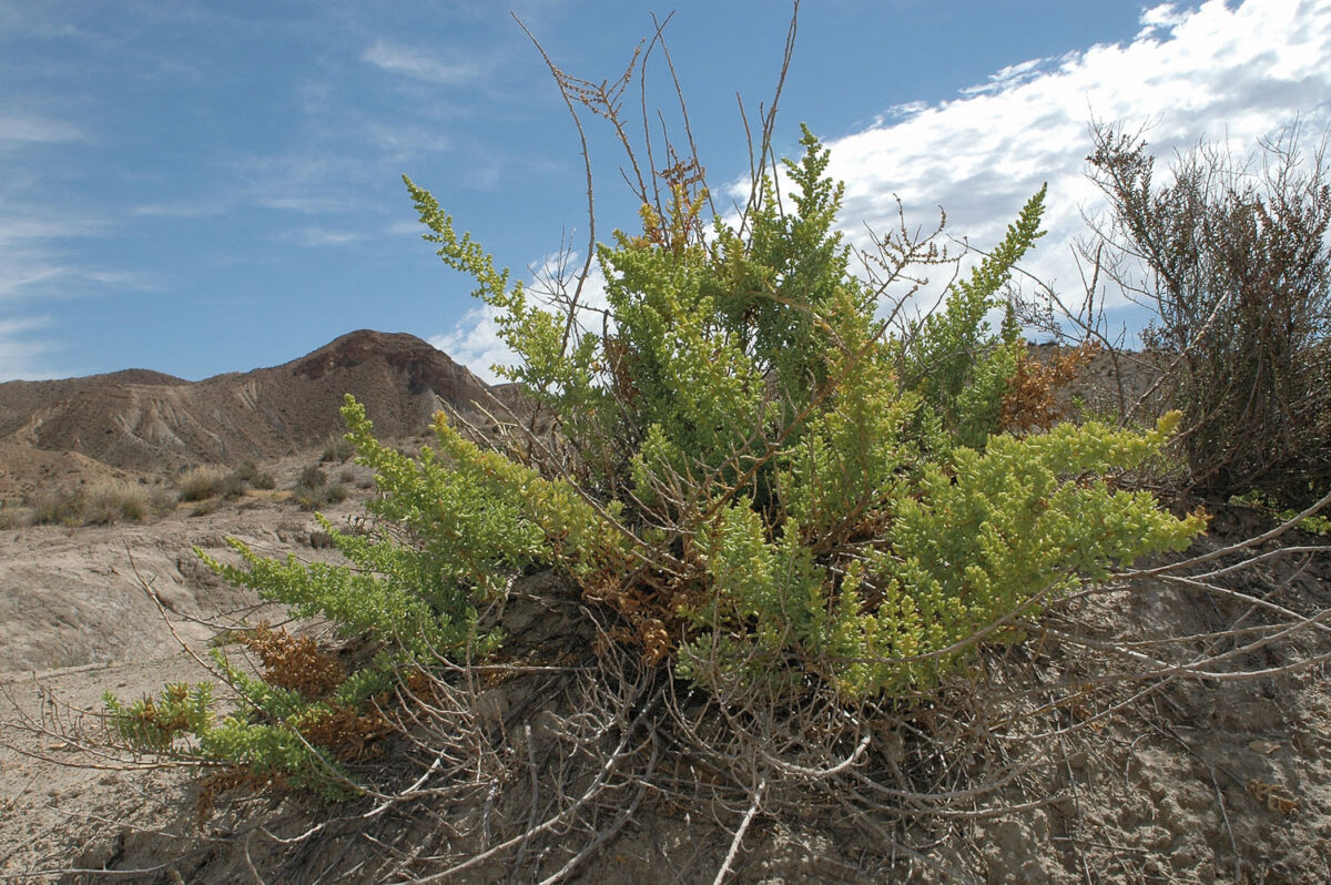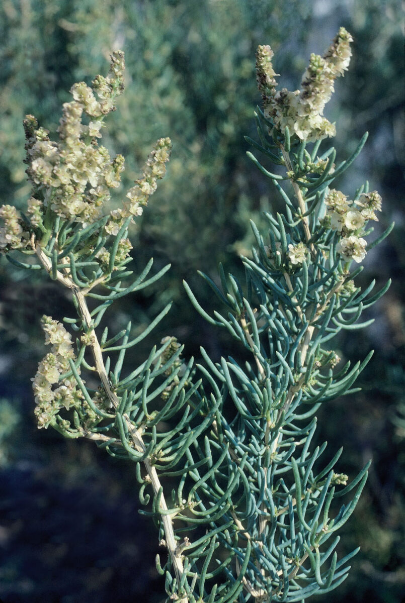 Arbusto erecto, glabro o con fascículos de pelos axilares, a veces con incrustaciones calcáreas muy dispersas a lo largo del tallo. Ramas erecto–patentes, generalmente blanquecinas, lisas o débilmente estriadas. Hojas c. 40 x 1(1,5) mm, alternas, mucronadas, generalmente curvadas. Inflorescencias en panículas terminales; brácteas dimorfas, las superiores ovado–triangulares, las inferiores semejantes a las hojas; bractéolas ovado–triangulares, de márgenes escariosos. Flores hermafroditas, pentámeras. Tépalos 5, que desarrollan un ala transversal en el dorso de hasta 6 mm, papirácea, blanquecina. Estambres 5. Ovario súpero; estigmas 2, de longitud menor o igual que la del estilo. Semillas horizontales