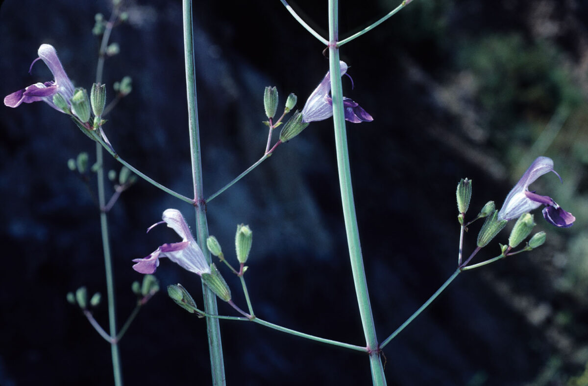 Planta con pelos tectores y glandulíferos. Hojas 3,5–16 x 1–4,5 cm, simples, en ocasiones con 2 segmentos en la base, pecioladas, de elípticas a oblongo–lanceoladas, crenuladas. Inflorescencia ramificada, formada por ramas opuestas de cimas largamente pedunculadas con (1)3(5) flores; brácteas 7–15 x 2–3 mm, de ovado–lanceoladas a oblongo–lanceoladas, caducas. Cáliz (5)10–15 mm, subbilabiado, tubular–campanulado, con 5 dientes subiguales, triangulares, acuminados. Corola 30–41 mm, bilabiada; labio superior ± recto, comprimido lateralmente, blanquecino–amarillento o blanquecino–violáceo, el inferior violáceo con manchas blancas; tubo con un anillo de pelos en el interior. Estambres 2, con conectivo subigual o más corto que el filamento. Núculas subglobosas
