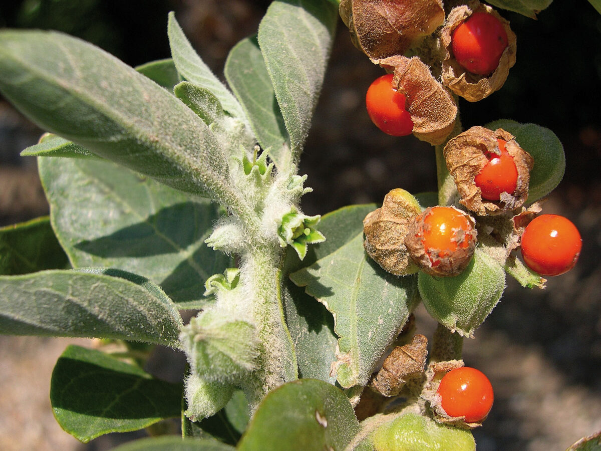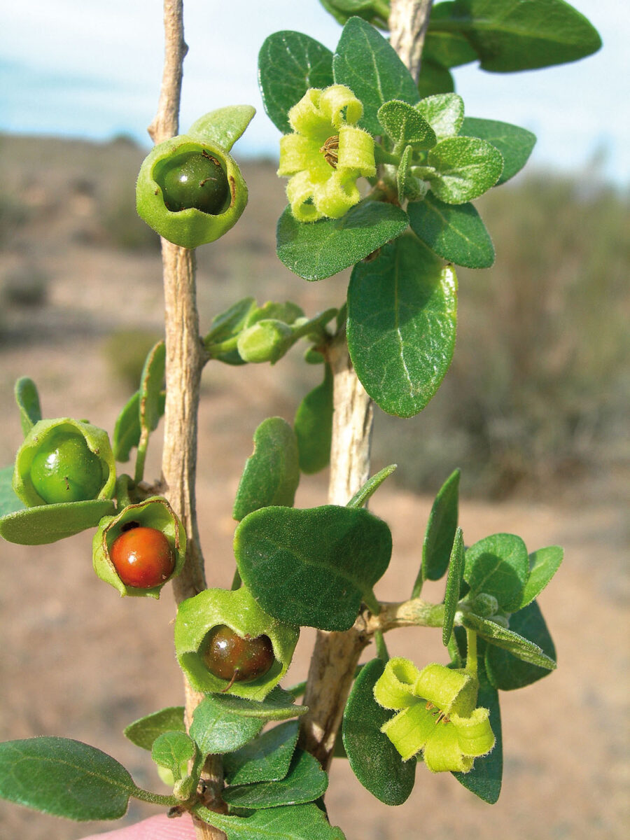 Arbustillo leñoso en la base, ramificado, pubescente. Hojas alternas, con pecíolo de 5–15 mm y limbo ovado o elíptico, entero, de base cuneada y ápice ± agudo, con pelos ramificados, más abundantes por el envés. Flores actinomorfas, hermafroditas, pentámeras, 3–8 en glomérulos axilares, cortamente pediceladas. Cáliz 3,5–6 mm en la antesis, acrescente, de hasta 15 mm y urceolado en la fructificación, dividido casi hasta la mitad en 5 lóbulos lanceolados. Corola 5–6 mm, infundibuliforme, amarillo–verdosa, pubescente, dividida hasta casi la mitad en 5 lóbulos lanceolados. Baya 5–8 mm, globosa, rojiza en la madurez, incluida en el cáliz