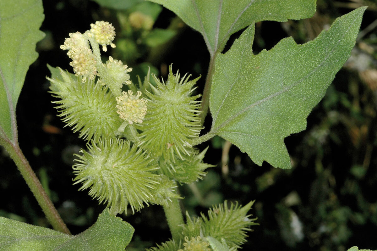 Anual, monoica, hispídula, escábrida. Tallos simples o poco ramosos. Hojas alternas, ovadas o subtriangulares, a menudo trilobadas, de margen irregularmente dentado o crenado; pecíolo 3–15 cm. Capítulos unisexuales, discoides, agrupados en la axila de las hojas, los masculinos multifloros, en glomérulos ± pedunculados; los femeninos sésiles o subsésiles, con 2 flores apétalas y brácteas involucrales internas soldadas entre sí y con el receptáculo encerrando a los 2 aquenios, en forma de estructura coriácea de 9–17 x 6–11 mm en la fructificación, con numerosas espinitas uncinadas, hirsutas y glandulosas y 2 picos apicales de 2,5–4 mm. Vilano ausente