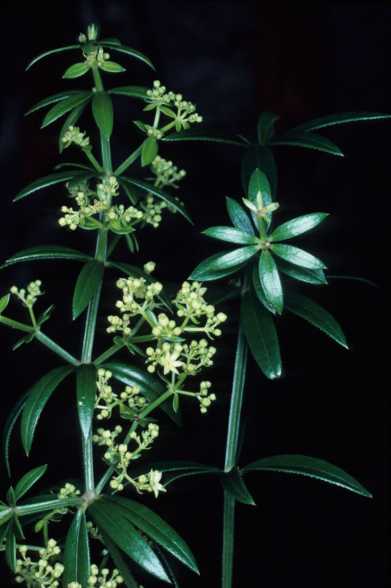 Estolonífera, con tallos esparcidamente retrorso–aculeolados en los ángulos, glabros o ± hirsuto–pelosos en los lados. Hojas (7,2)10–52 mm, en verticilos de (6)8(10), sésiles, de linear–lanceoladas a espatuladas –falcadas al secarse–, con márgenes revolutos, agudas, aristadas, herbáceas, glabras, aculeoladas. Brácteas similares a las hojas. Inflorescencia terminal, paniculiforme, muy laxa. Flores actinomorfas, hermafroditas, por lo general pentámeras –más rara vez tetrámeras o hexámeras–, con pedicelos glabros; cáliz nulo; corola (3,6)4–7,2 mm de diámetro, rotácea, con (4)5(6) lóbulos, triangular–lanceolados, caudado–apiculados, amarillo–verdosa; estambres (4)5(6), con anteras de 0,4–0,5 mm, curvadas al secarse. Mericarpos 1(2), de (3,5)4–7 mm, globosos, carnosos, negros, glabros