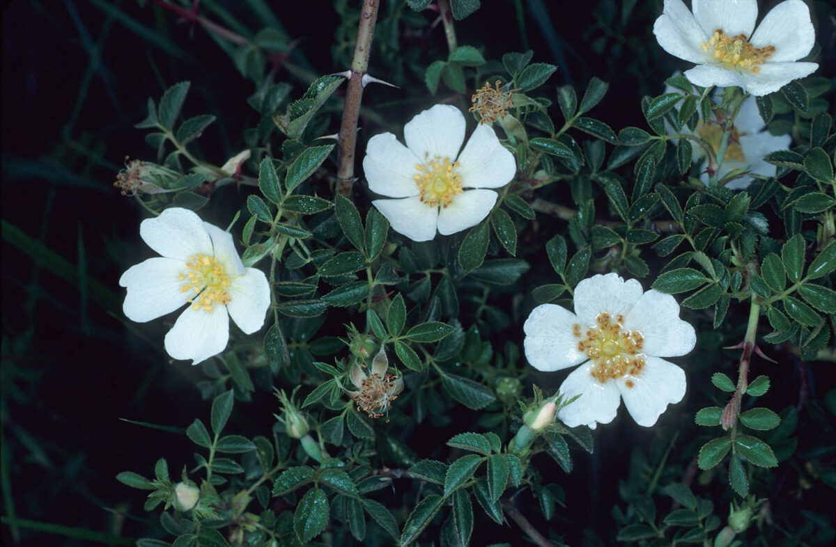 Arbusto perennifolio, de tallos trepadores o procumbentes, glabros, con aguijones ± dispersos. Hojas coriáceas, imparipinnadas, con (3)5(7) folíolos; folíolos 25–80 mm, ovado–lanceolados, acuminados, de margen aserrado; estípulas 9–19 mm. Inflorescencias corimbiformes o flores solitarias. Flores 2,5–5 cm de diámetro, actinomorfas, hermafroditas, pentámeras; disco del receptáculo de 3–5 mm, con orificio de 0,7–1 mm; sépalos 5–9 mm, reflejos y caducos, enteros (a veces con lóbulos poco desarrollados), con apéndice setiforme, glandulosos en la cara externa; pétalos 15–30 mm, escotados, blancos; estambres numerosos; estilos soldados en una columna tan larga como los estambres del verticilo interno. Cinorrodon c. 10 mm, subgloboso, glabro, rojo