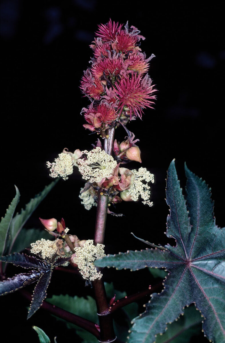 Arbustos o pequeños árboles monoicos, sin látex. Hojas 8–40 cm de diámetro, simples, alternas, peltadas, palmatipartidas, palmatinervias, con 5–9 segmentos lanceolados, agudos, el central de mayor longitud que los laterales, con el margen dentado. Flores unisexuales, con pedicelos articulados, reunidas en panículas erectas terminales y axilares, con las flores femeninas apicales y las masculinas en la base. Periantio formado por 3–5 piezas verdes o rojizas. Flores masculinas con estambres arborescentes; las femeninas con ovario trilocular y trilobulado, setoso, rematado por 3 estilos con estigmas bífidos, con un solo primordio seminal en cada lóculo. Fruto 10–24 x 16–20 mm, capsular, esquizocárpico, trígono, aculeado; semillas 8–15 mm, elipsoideas, comprimidas dorsiventralmente, lisas y jaspeadas, con carúncula