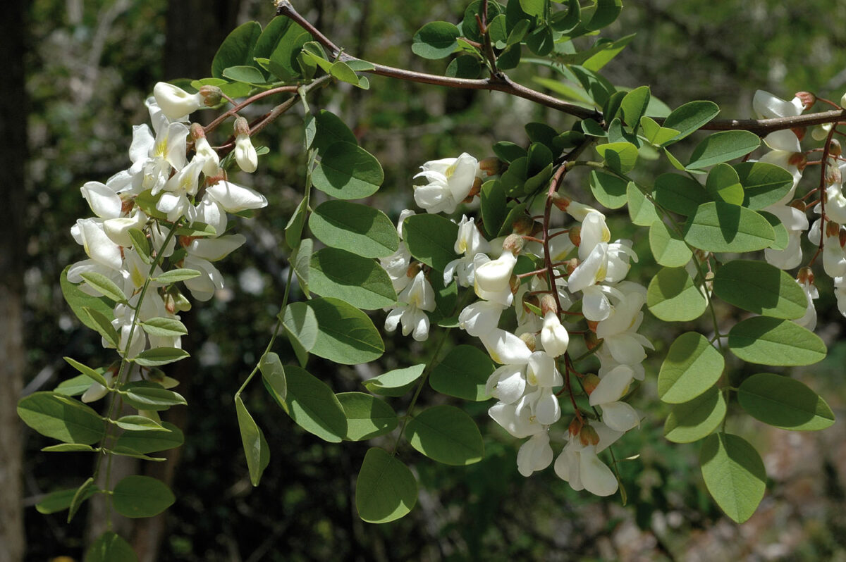 Copa abierta y rala. Hojas 3–30 cm, alternas, imparipinnadas, con 3–11 pares de folíolos; estípulas caducas que se sustituyen por espinas < 1 cm; folíolos 14–60 mm, elípticos u ovados. Inflorescencias en racimos péndulos, con 10–35 flores papilionadas, sobre los tallos de primavera. Cáliz ligeramente bilabiado, con dientes desiguales; corola blanca, con tonalidades amarillo–verdosas. Estambres 10, diadelfos, con el estambre vexilar libre en la base y adherido a los demás en el resto de la mitad inferior. Ovario subglabro o seríceo, estipitado; estilo acodado en la base, glabro en la base y piloso en el tercio superior. Legumbre 3–12 x 1–1,5 cm, linear–oblonga, con carpóforo de 2–5 mm, a menudo ligeramente contraída entre las semillas, que son variables en número (2–15)