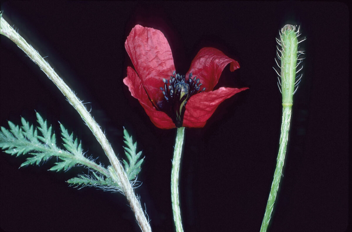 Tallo simple o ramificado, esparcidamente peloso. Hojas 1–12 x 0,5–2(3) cm, de margen revoluto, las basales pecioladas, pinnatipartidas o 1–2–pinnatisectas, con segmentos oblongo–lanceolados, generalmente aristados; las caulinares sésiles, con segmentos lineares, aristados. Flores solitarias, actinomorfas, hermafroditas, sobre largos pedúnculos glabros o con setas adpresas. Sépalos 2, oblongo–ovoideos, pelosos. Pétalos 4, de 1,2–1,8(2) x 0,7–1,2(1,5) cm, obovados, no imbricados, rojo–anaranjados, con mancha negra en la base. Estambres numerosos con filamentos gradualmente ensanchados y anteras pardo–azuladas. Ovario súpero. Cápsula 10–20(25) x (2)3–5 mm, oblongo–obovoidea o cilíndrica, dehiscente por poros apicales, con setas adpresas; estigmas 4–6, convexos; semillas reniformes, alveolado–reticuladas