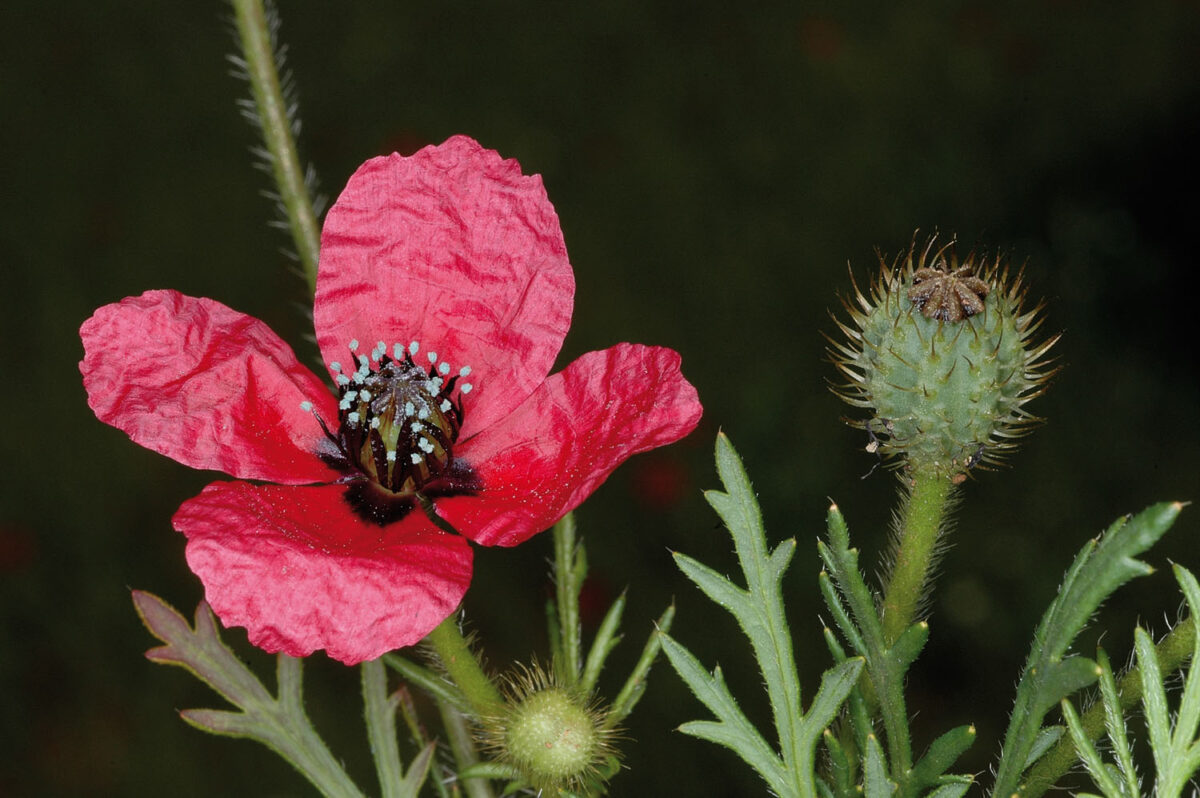 Uno o varios tallos, simples o más frecuentemente con ramas ascendentes, foliosos, híspidos. Hojas basales largamente pecioladas, bi o tripinnatipartidas, con segmentos linear–lanceolados, aristados; las caulinares subsésiles, similares a las basales, todas híspidas. Flores solitarias, actinomorfas, hermafroditas, sobre pedúnculos axilares recios, híspidos o con pelos adpresos. Sépalos 2, híspidos. Pétalos 4, de 1,5–2 x 0,5–1 cm, obovoideos, rojizos, generalmente con mancha negra. Estambres numerosos, de filamentos ensanchadados gradualmente y anteras azuladas. Ovario súpero. Cápsula 8–12(15) x 5–8(10) mm, subglobosa, cubierta de setas arqueado–ascendentes; disco estigmático con 6–9 radios, convexo