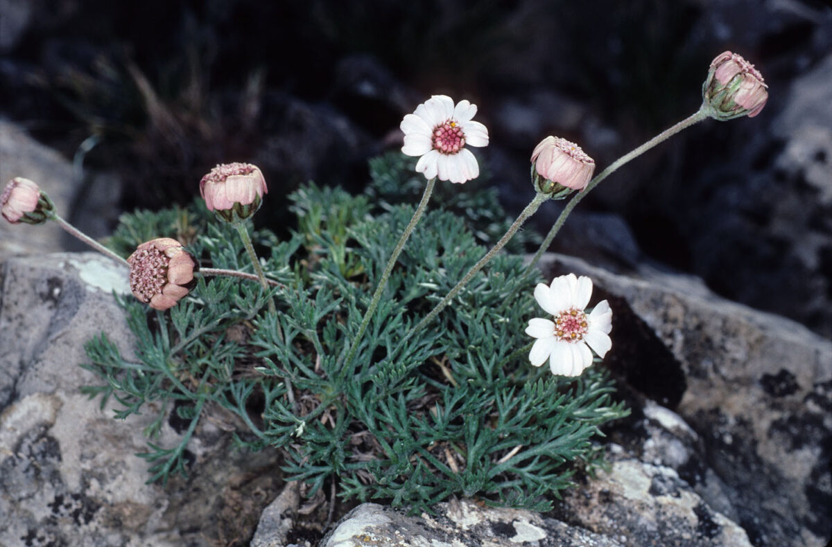 Vivaz, rizomatosa, cespitosa, vilosa, a veces serícea. Tallos muy cortos, de los que parten los escapos simples, afilos y monocéfalos, arqueado–ascendentes. Hojas rosuladas, pecioladas, 2–3–palmatisectas, con segmentos lineares. Capítulos (12)15–25 mm de diámetro, radiados, solitarios, terminales; involucro con (4)5 filas de brácteas vilosas, con reborde escarioso y ferruginoso ± oscuro, decurrente hasta la base. Flores rosadas; las externas hemiliguladas, femeninas; las internas flosculosas, hermafroditas. Aquenios 3,2–4 mm, estrechamente obovoideos, con 5–6 costillas pajizas muy prominentes, alternando con 5–6 valéculas muy oscuras; vilano 1,5–2 mm, en forma de corona escariosa, lacerada