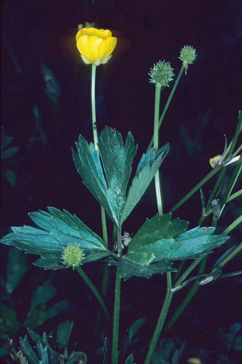 Cepa gruesa, con raíces cilíndricas y tallos estoloníferos que emiten raíces fibrosas desde los nudos. Tallos erguidos o ascendentes, estriados, fistulosos, ramificados en la parte superior, pelosos o glabrescentes. Hojas basales envainadoras, largamente pecioladas; limbo subpentagonal, 3–secto, con segmentos 2–3 lobados e irregularmente dentados, el central peciolulado; las caulinares más pequeñas. Cimas paucifloras, con 2–6 flores largamente pedunculadas. Flores 18–30(32) mm de diámetro, actinomorfas, hermafroditas; sépalos 5, patentes, adpreso–pelosos; pétalos 5, amarillos; estambres numerosos; gineceo apocárpico, súpero. Fruto poliaquenio, ovoideo, denso; receptáculo peloso; aquenios lenticulares, lisos, con margen aquillado y pico corto, subterminal, casi recto