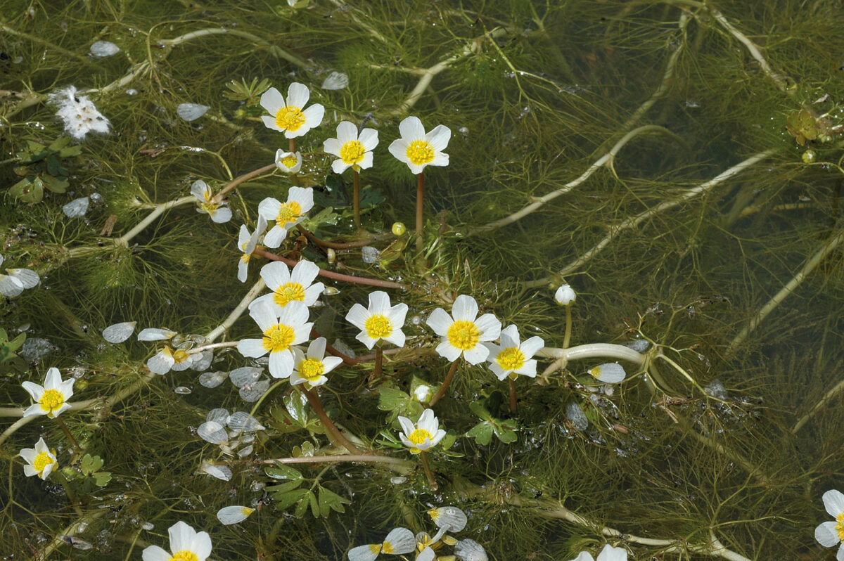 Tallo débil, poco ramoso. Hojas dimórficas o sólo laminares, con estípulas membranáceas soldadas parcialmente al pecíolo; las divididas en segmentos capilares confinadas a los nudos inferiores, subsésiles, con segmentos divergentes; las laminares largamente pecioladas, con limbo dividido hasta más de la mitad en 3(5) lóbulos cuneados, distantes, de margen entero o crenado. Flores 3–11 mm de diámetro, actinomorfas, hermafroditas, solitarias sobre pedúnculos tan largos o algo más cortos que el pecíolo de la hoja laminar opuesta; sépalos 5, de 1,5–3 mm, azulados en el ápice, reflejos; pétalos 5, de 2,5–5(6) mm, blancos; estambres 5–10; gineceo apocárpico, súpero. Fruto poliaquenio, globoso; receptáculo peloso; aquenios glabros, poco numerosos, con estilo subterminal ganchudo