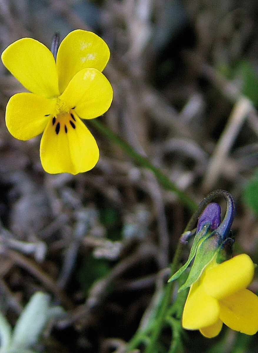 Tallos cortos, ascendentes, débiles, glabrescentes. Hojas 5–12 x 6–11 mm, anchamente ovadas o suborbiculares, truncadas o cordadas en la base, crenadas, hírtulas, pecioladas; estípulas foliáceas, palmatipartidas, con segmentos inferiores lineares, el central similar a las hojas. Flores solitarias sobre pedúnculos bracteados, zigomorfas, hermafroditas, pentámeras, dialipétalas; sépalos 3–6,5 mm, cortamente apiculados, glabros; pétalos mucho más largos que los sépalos, de color amarillo vivo, los superiores emarginados con estrías oscuras, los laterales dirigidos hacia arriba; espolón 1,5–3,5 mm, sacciforme y grueso, teñido de violeta. Cápsula 6–8 x 4–6 mm, sub-globosa, glabra; semillas c. 2 mm, marrones