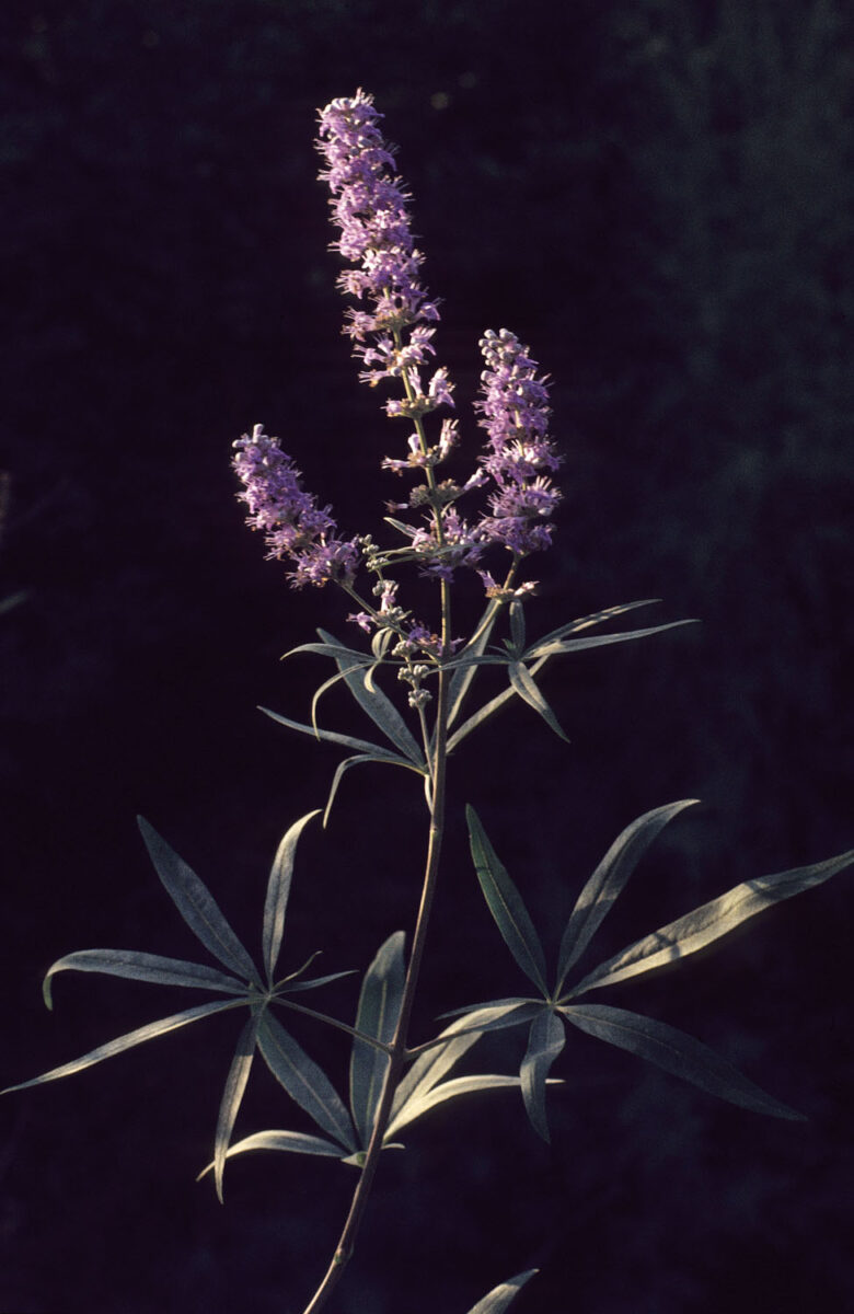 Arbusto o arbolito aromático, con tallos jóvenes de sección cuadrangular. Hojas opuestas y decusadas, largamente pecioladas, palmaticompuestas, con 3–7 folíolos de 3–15 x 0,5–2 cm, de lineares a lanceolados, enteros o subenteros, agudos. Inflorescencias de hasta 30 cm, espiciformes, con hasta 22 verticilastros por espiga. Flores zigomorfas, hermafroditas, pentámeras, sésiles o subsésiles. Cáliz campanulado y terminado en 5 dientes pequeños y triangulares. Corola 6–10 mm de longitud, bilabiada, de color azul o violeta, con el tubo 2–3 veces más largo que el cáliz. Estambres 4, exertos, al igual que el estilo. Ovario súpero, bicarpelar. Drupa 3–5 mm de diámetro, globosa, de color púrpura oscuro, con 4 pirenos