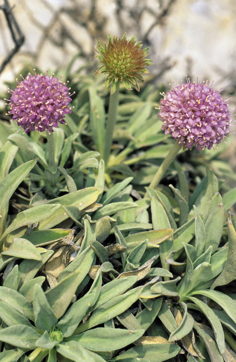 Tallos con pelos simples y estrellados, glabrescentes en la madurez al menos en la parte media. Hojas basales en rosetas superpuestas, las caulinares opuestas, atenuadas, lanceoladas, elípticas u oblongo–lanceoladas, de haz verdoso y envés blanquecino, densamente tomentosas, con pelos estrellados. Inflorescencias 25–40 mm de diámetro en la antesis, capituliformes, pedunculadas, con 2 filas de brácteas involucrales de 6–12 mm; receptáculo peloso. Bractéolas lineares o estrechamente espatuladas, más cortas que las flores. Involucelo 4,5–7,7 mm, subcilíndrico–tetrágono, con 8 gruesas costillas separadas por surcos ± dilatados en su parte distal, peloso, con corona de 2–2,5 mm, tetralobulada, escariosa e hialina, densamente pelosa. Flores subactinomorfas, hermafroditas, tetrámeras, subiguales. Cáliz pateniforme, cuadrangular, hirsuto y con pelos glandulíferos, con (4)5(6) aristas de (8)10–14 mm, plumosas. Corola 10–14 mm, rosada o de un blanco rosado, pelosa