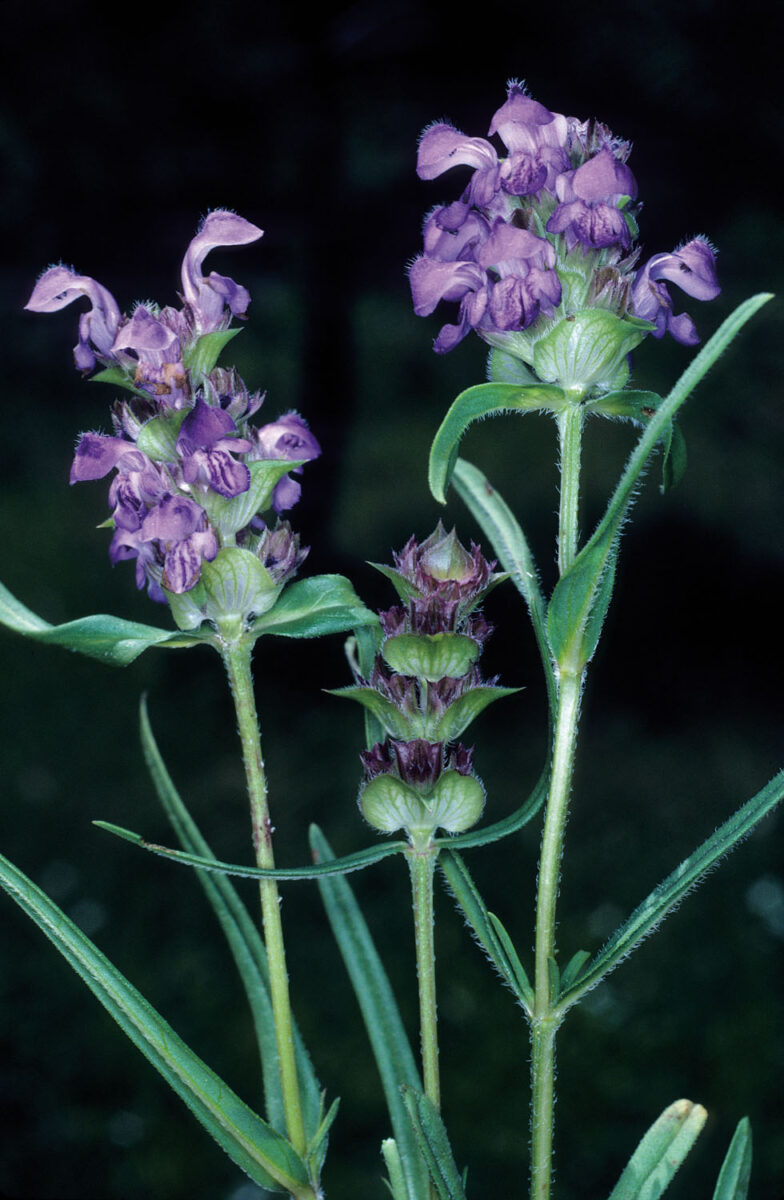 Erecta o ascendente, rizomatosa, estolonífera. Hojas 30–70 x 3–15 mm, linear–lanceoladas u oblanceoladas, enteras, las basales pecioladas, las caulinares sésiles. Inflorescencia en espiga de verticilastros, terminal, densa; brácteas 6–10 x 10–15 mm, anchamente ovadas, enteras, ciliadas, glabras. Cáliz 8–9 mm, bilabiado, con 10 nervios; labio superior plano–convexo, con 3 dientes ovados, el inferior con 2 dientes lanceolados, purpúreos. Corola 11–15 mm, bilabiada, azul violeta; labio superior convexo, entero, el inferior trilobulado