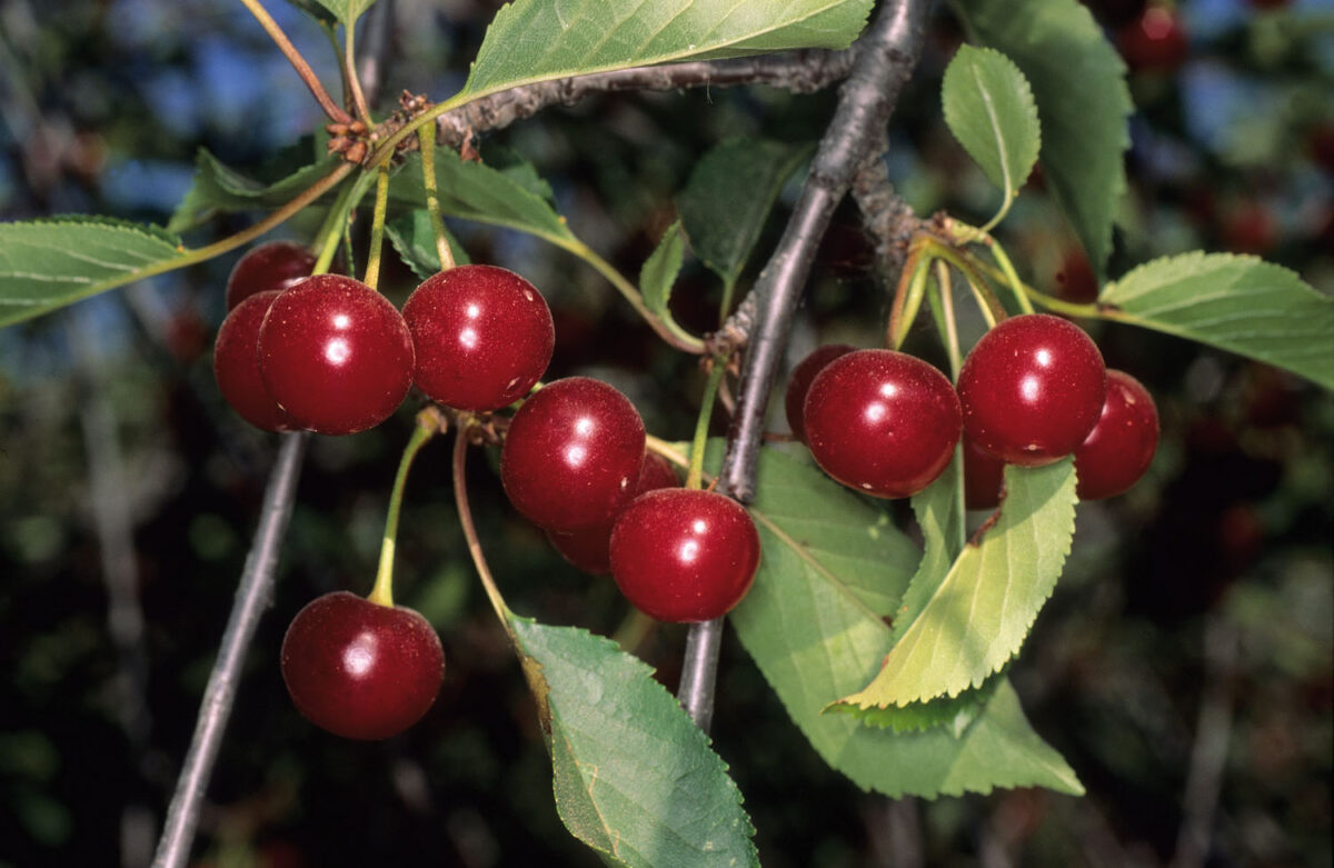 Árbol de corteza grisácea, casi lisa, que se resquebraja y ennegrece con el tiempo. Hojas (5)6–15 x 3–8(9) cm, obovadas, oblanceoladas o ± largamente elípticas, acuminadas, crenadas o aserradas con dientes glandulíferos, de haz verde–mate y glabro y envés ± pubescente; pecíolo 1,5–4,5(5) cm, por lo general con dos gruesas glándulas rojizas o negruzcas cerca del punto de unión con la lámina. Flores actinomorfas, hermafroditas, pentámeras, 2–6 en fascículos umbeliformes rodeados en la base por una corona de brácteas cocleariformes, olorosas, coetáneas con las hojas jóvenes, glabras; pedicelos 20–50(60) mm; receptáculo urceolado; pétalos 8–17 mm, patentes o erecto–patentes, obovados, obtusos o emarginados, blancos; ovario glabro. Drupa 9–17(20) mm, globosa o cordiforme, rojo ± oscura, amarillo–crema o casi negra en las razas cultivadas, glabra; mesocarpo carnoso, dulce o algo amargo; endocarpo subgloboso, casi liso