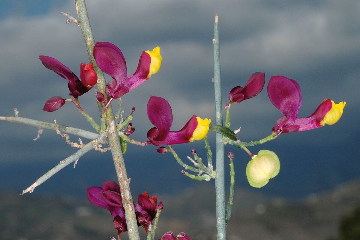 Arbusto genistoide; tallos de ápice espinescente, con estrías no muy marcadas, glabros, algo pubescentes en nudos y ramillas jóvenes. Hojas 6–13 x 1,4–2,2 mm, caedizas, alternas, simples, linear–lanceoladas, enteras, glabras, con pecíolo de c. 0,7 mm. Inflorescencias racemosas, axilares, con 3–4 flores de las que suelen abortar de 1–3. Flores zigomorfas, hermafroditas. Sépalos 5, libres, de color púrpura; los 2 internos (alas) más grandes y petaloideos, de 11,7–13,3 x 5–7 mm, caedizos, obovados u oblanceolados. Pétalos 3, de 14–18 mm, soldados en tubo de color púrpura y con lóbulos amarillos, el inferior (quilla) entero. Estambres 8(9), monadelfos. Ovario súpero. Cápsula 7,1–8 x 7,6–8,3 mm, aplanada, anchamente obovada u orbicular, con 2 valvas y ala marginal, sin carpóforo