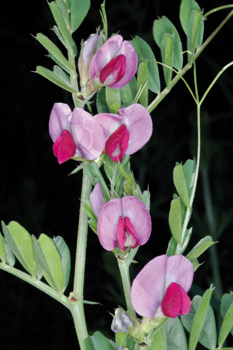 Hírtula o glabrescente. Hojas 33–90 mm, con 4–7 pares de folíolos, terminadas en un zarcillo ramificado; estípulas hemihastadas, inciso–dentadas o de borde entero, con un nectario oscuro en la cara abaxial; folíolos 8–31 x 2–14(16) mm, oblongos, oblanceolados o elípticos, más raramente lineares, obtusos o emarginados, caudados. Flores 20–22 mm, papilionadas, axilares, generalmente solitarias. Cáliz (10)11,5–18 mm, actinomorfo; dientes (5)6–11 mm, frecuentemente más largos que el tubo, estrechamente triangulares, más o menos subulados. Pétalos de color violeta a rojo púrpura, virando a azul violeta al secarse. Legumbre 35–65 x 6–9 mm, linear–oblongoidea, comprimida, sentada, con valvas marcadamente contraidas entre las semillas, glabra o pubescente, con suturas cilioladas y 4–9 semillas. Semillas 4–5 mm; hilo 1,8–2,6 mm, 1/8–1/5 del contorno de la semilla