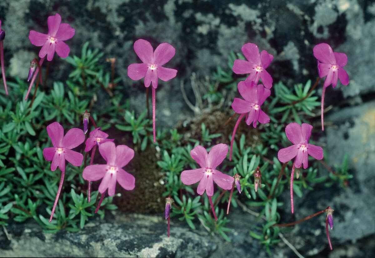 Cepa leñosa, engrosada, que emite numerosos tallos lignificados en la parte inferior, erectos o ascendentes, gráciles, rojizos, foliosos en la porción superior. Hojas (5)7–15 x 1–2 mm, linear–lanceoladas, sésiles, glabras, con punteaduras rojizas; estípulas similares a las hojas, las superiores indivisas, las de las hojas medias e inferiores alguna vez bisectas o trisectas. Flores solitarias sobre pedúnculos bracteados, zigomorfas, hermafroditas, pentámeras, dialipétalas; sépalos 4–5 mm, lanceolados, agudos; pétalos mucho más largos que los sépalos, rosado–purpúreos, los laterales dirigidos hacia arriba, el inferior profundamente bilobado; espolón 20–30 mm, filiforme, recto o curvo, casi horizontal. Cápsula c. 5 x 4 mm, subovoidea, glabra; semillas c. 2,5 mm, de color castaño