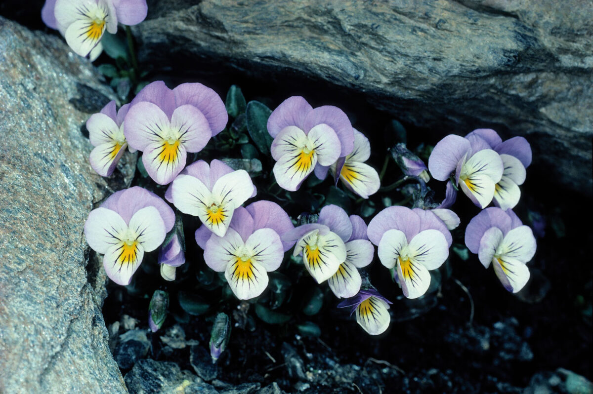Cepa leñosa que emite numerosos tallos débiles, procumbentes, fértiles o estériles, desnudos en su parte inferior, foliosos en la superior. Hojas 7–15 x 4–7 mm, ovadas, elípticas, espatuladas o suborbiculares, enteras, glabras o pubérulas, pecioladas; estípulas similares a las hojas, más pequeñas. Flores solitarias sobre largos pedúnculos bracteados, zigomorfas, hermafroditas, pentámeras, dialipétalas; sépalos 5,5–8 mm, lanceolados, con estrecho margen hialino, glabros o pubérulos, con apéndice basal de 1–1,5 mm; pétalos de color azul–violeta a rosado, mucho más largos que los sépalos, los laterales dirigidos hacia arriba, el inferior 8–13 mm, de ápice algo emarginado, con una mancha amarilla en la base y estrias radiales oscuras que también aparecen en los dos pétalos laterales; espolón 2–3 x 1,5–2 mm, obtuso. Cápsula 6–10 x 4,5–7 mm, ovoidea, acutiúscula, glabra; semillas 1,8–2 mm, amarillentas