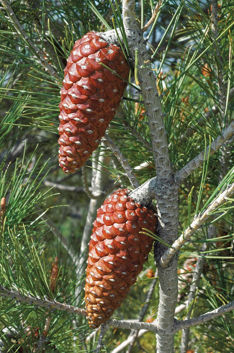 Es el único pino español que brota de tronco, tras un incendio, y de cepa, una vez cortado; tiene acículas muy largas (20–30 cm) y flexibles, dispuestas de tres en tres; estróbilos 12–20 cm