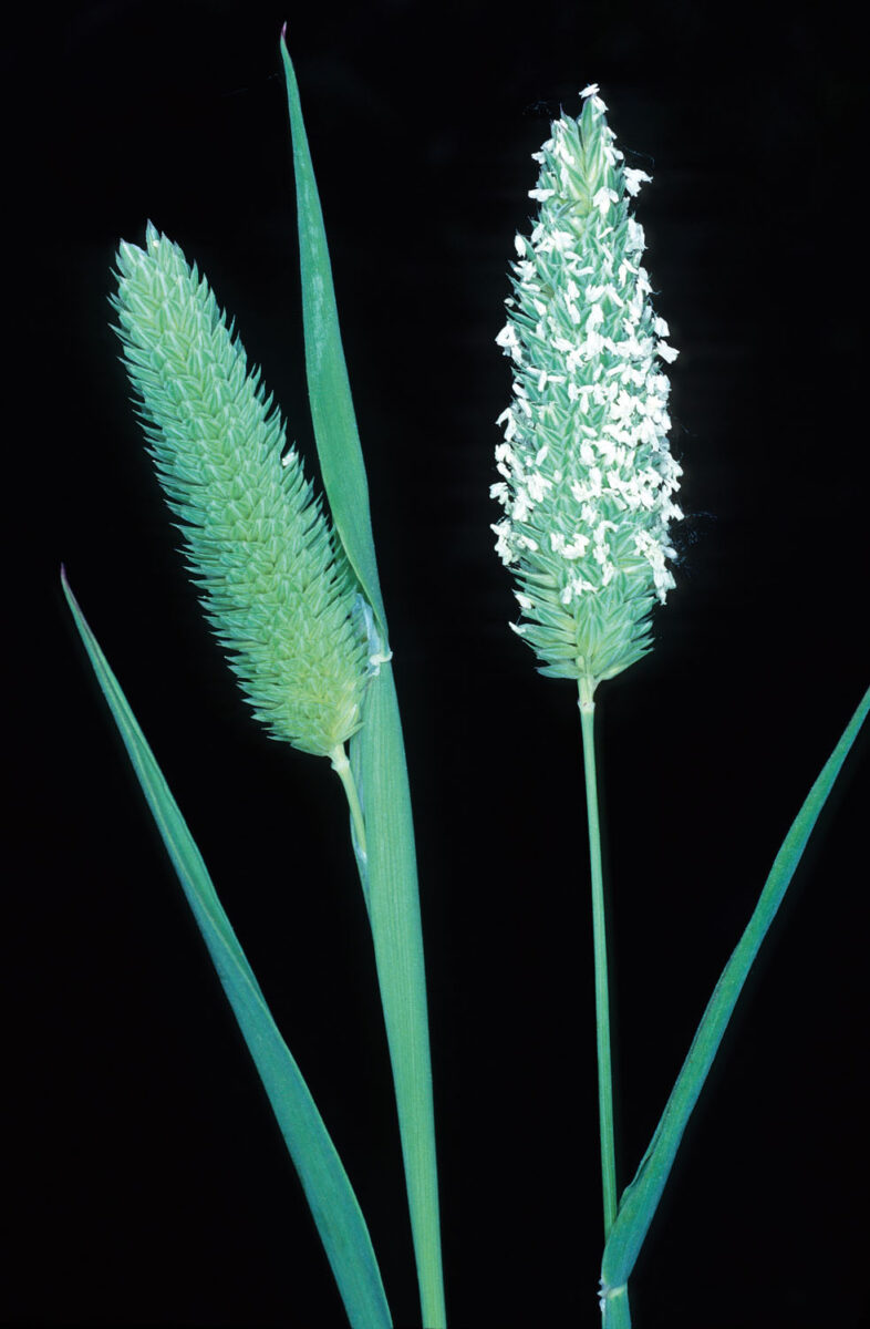 Vaina de la hoja superior del tallo dilatada; lámina de las hojas hasta 25 cm x 4–11 mm, plana; lígula 4–8 mm, truncada, lacerada, membranácea. Panícula 1,3–7(8) cm, de contorno oval, densa, muy contraída. Espiguillas 4–6(7) mm, muy comprimidas, con una flor fértil y 1 rudimento estéril en la base; glumas iguales, más largas que la flor, trinervadas, coriáceas, cortamente apiculadas, con ala en la ½ superior de la quilla, irregularmente dentada en el ápice; lema 2,5–3,8 mm, coriáceo, de dorso redondeado, pubescente y brillante, con 1 rudimento estéril de 1–1,5 mm que alcanza algo más de 1/3 de la longitud del lema; pálea pubescente, un poco más corta que el lema. Anteras c. 2 mm