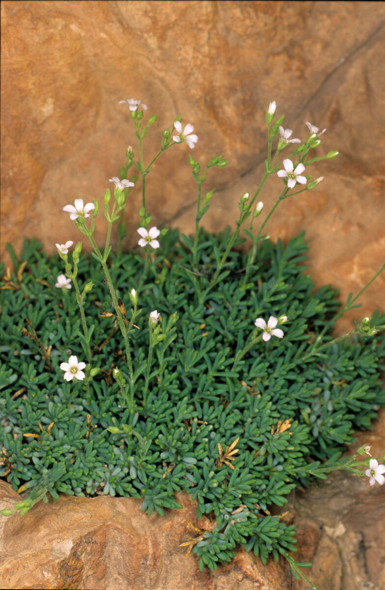 Planta cespitosa, glabra en la mitad inferior, pubérulo–glandulosa en las inflorescencias; cepa leñosa, tortuosa. Tallos ramificados, erectos o ascendentes. Hojas 3–6 x 0,7–1 mm, opuestas, imbricadas, connadas, lineares u oblanceoladas, subtriquetras, mucronadas, ciliadas en la base, crasas. Monocasios o dicasios compuestos; pedicelos 2–7 mm, rectos. Flores actinomorfas, hermafroditas, pentámeras. Cáliz 3–3,5 mm en la fructificación, campanulado, hendido hasta más de la mitad; lóbulos lanceolados, agudos, de margen ciliado. Pétalos 3–4,5 mm, emarginados o denticulados, blancos. Cápsula inclusa, ovoidea, con 4 valvas. Semillas reniformes, con tubérculos prominentes en el dorso, negras