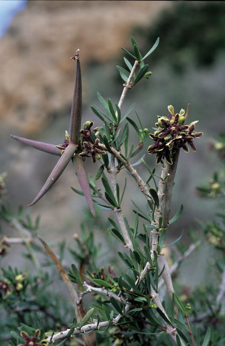 Arbusto de ramas tortuosas, glabro, con látex blanco. Hojas (1)1,7–3 x 0,2–0,5 cm, perennes, opuestas o fasciculadas, simples, estrechamente oblanceoladas u oblongo–lineares, coriáceas, enteras, adelgazadas hacia la base. Flores 10–20 mm de diámetro, actinomorfas, hermafroditas, pentámeras, en cimas axilares paucifloras; pétalos 4–9 x 2–3 mm, soldados en la base, oblongos, patentes, rojo oscuros con el borde verdoso o verdosos; corona de 5 apéndices ganchudos que alternan con los pétalos; estambres unidos al gineceo. Fruto difolículo; folículos 5–8 x 0,7–0,9 cm, al principio convergentes y formando un ángulo de 180º en la madurez; semillas con penacho de pelos sedosos de 15–28 mm