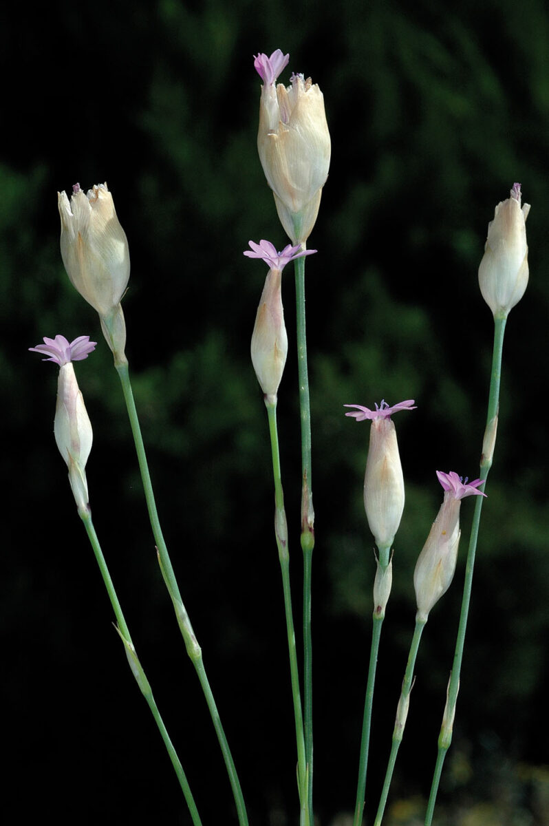 Tallos simples o bifurcados, glabros. Hojas 5–40 x 0,5–3 mm, opuestas, connadas, lineares o linear–lanceoladas, las basales espatuladas, uninervadas, de margen escábrido; vainas foliares tan largas como anchas. Inflorescencias en cabezuelas, a veces reducidas a 1 flor; brácteas tan largas como los cálices, envolviéndolos, ovado–acuminadas o suborbiculares, las externas aristadas, escariosas. Flores actinomorfas, hermafroditas, pentámeras. Cáliz 10–12 mm, tubuloso, con dientes obtusos, pubérulo. Pétalos con limbo de 2,5–4 mm, truncado o emarginado, morado o purpúreo. Cápsula oblongoidea, con 4 dientes. Semillas 1,3–1,9 mm, naviculares, estriado–reticuladas, negras