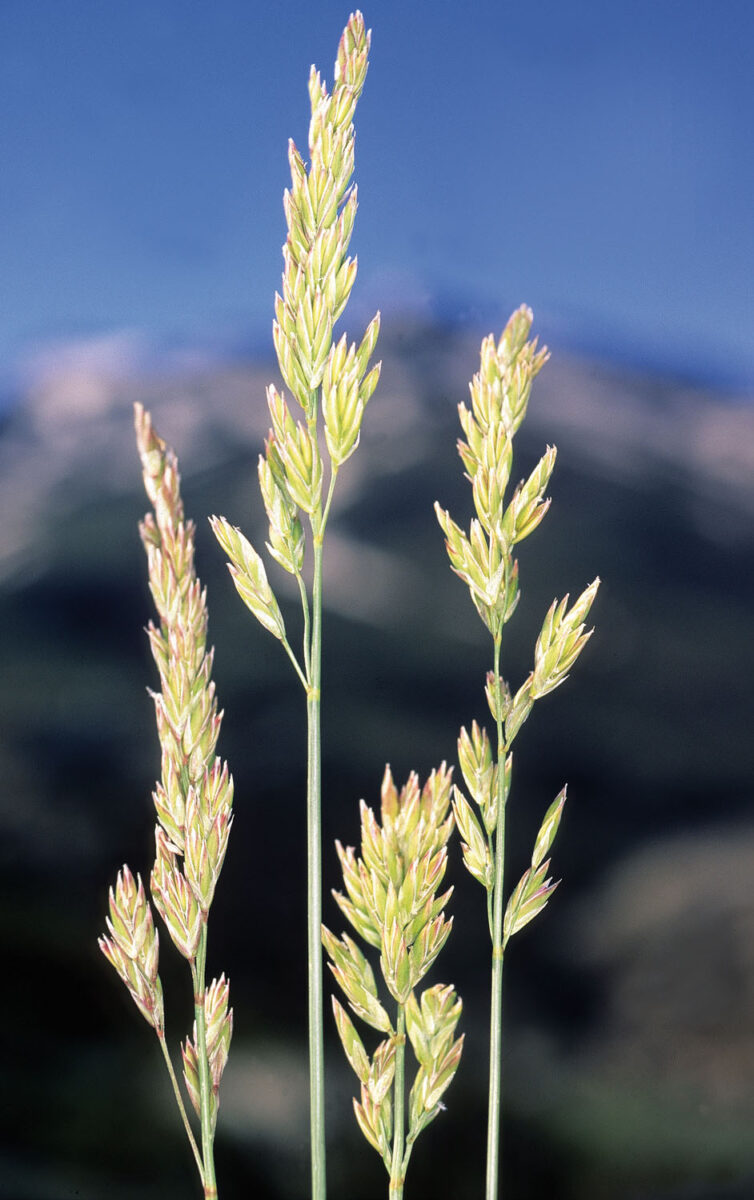 Renuevos intravaginales, vernación conduplicada. Hojas de los renuevos plegadas en la base, abiertas cerca del ápice; bases de las vainas engrosadas, de color pardo; vainas marcescentes, disgregándose en fibras paralelas; epidermis del envés del limbo de las hojas de los brotes estériles con estomas y abundantess células cortas; lígula c. 0,45 mm, truncada; lámina (0,5)0,8–1,2(3) mm de anchura, de margen escábrido; trabéculas de esclerénquima en los nervios principales, puentes en el envés en los secundarios y bloques en el envés frente a los terciarios, bloques de esclerénquima del envés decurrentes, en ocasiones conectados formando un anillo, células buliformes en los valles centrales del haz. Panícula 7–15 cm, cilíndrica, con (19)40-77 espiguillas, raquis con (6)9-11(12) nudos. Espiguillas (9)10–11(15) mm, obovadas, con 3–8 flores verdes o variegado–violáceas; glumas lanceoladas, con margen escarioso, subiguales, la inferior 5–7,5 mm, la superior (6)6,5–8,5 mm; lema 7–8(10,5) mm, lanceolado, mútico, con margen escarioso; pálea igualando la longitud del lema, lanceolada, bidentada. Ápice del ovario esparcidamente pubescente