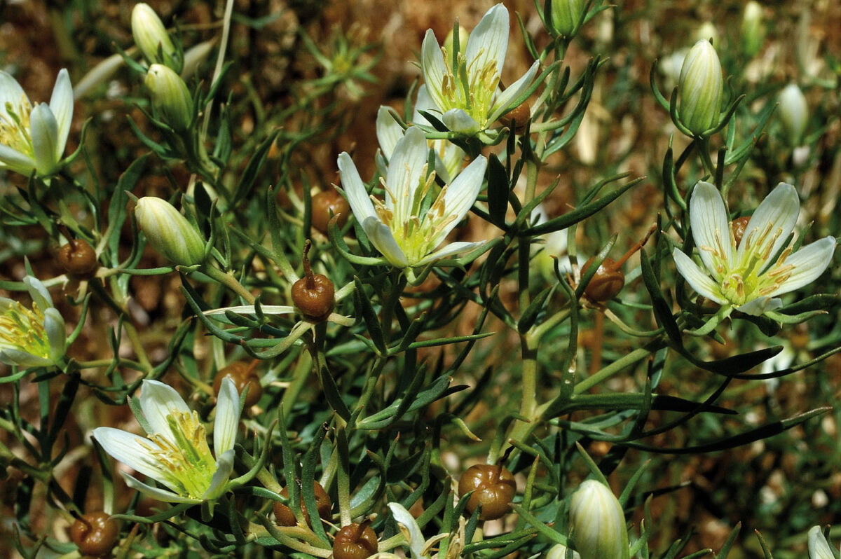 Hierba erecta, glabra o glandulosa, muy ramificada, de base algo leñosa. Hojas 2,5–6 cm, alternas, bipinnatisectas, algo crasas, con divisiones de último orden linear–lanceoladas y agudas; estípulas 1,5–3 mm, lineares, acuminadas. Flores actinomorfas, hermafroditas, terminales, solitarias; sépalos 4–5, de 8–15 mm, libres, lineares, desiguales, persistentes; pétalos 4–5, de 10–17 mm, libres, blanco–amarillentos. Estambres 10–15. Ovario súpero; carpelos 3. Cápsula 5–10 mm (sin estilo), globosa, con estilo largo y persistente, que se abre por 3 valvas
