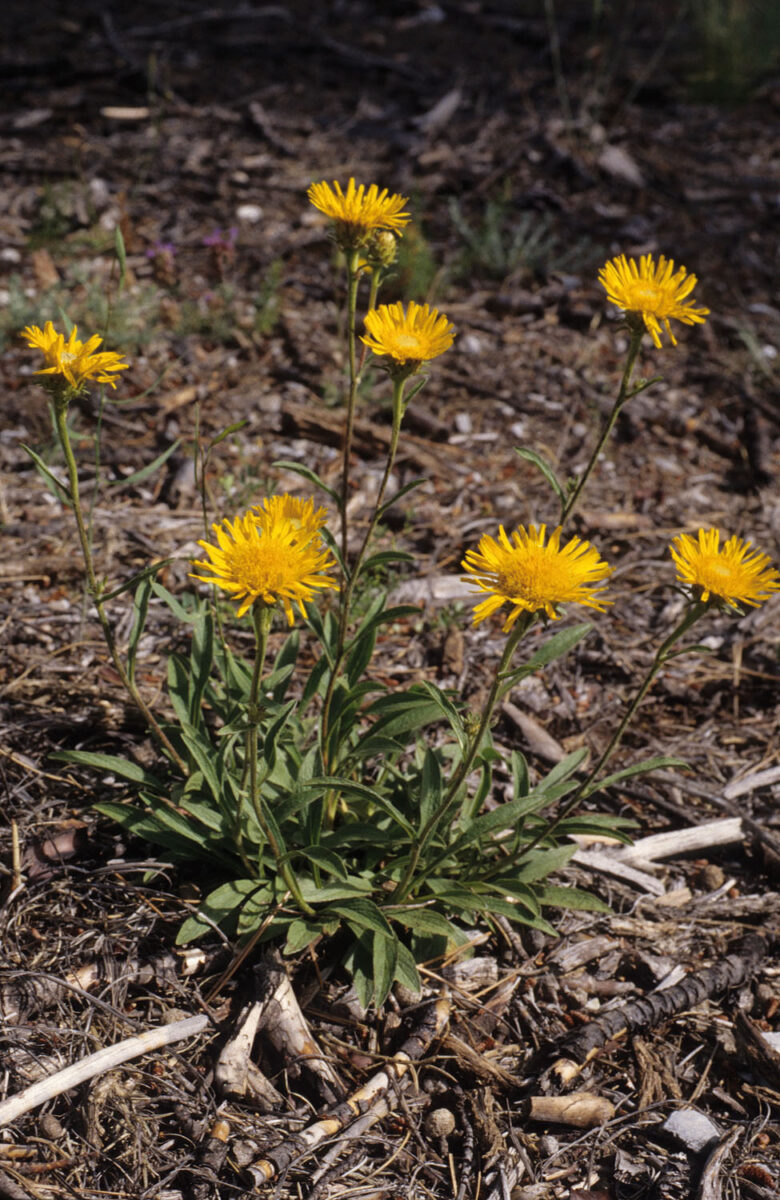 Vivaz, rizomatosa, densamente pubescente. Tallos erectos, ramificados en el tercio superior. Hojas alternas, lanceoladas, pubescentes, a veces seríceas, las inferiores pecioladas, las superiores sésiles, ovado–lanceoladas, auriculado–amplexicaules. Capítulos 2–6, radiados, con algunas hojas involucrantes, en inflorescencia corimbiforme; involucro con varias filas de brácteas linear–lanceoladas, de base blanquecina y el resto verdoso, densamente pubescentes. Flores amarillas, las externas hemiliguladas, femeninas, con limbo de 7–15 mm; las internas flosculosas, hermafroditas. Aquenios 1,5–2 mm, esparcidamente pubescentes; vilano 7–8 mm, de pelos escábridos