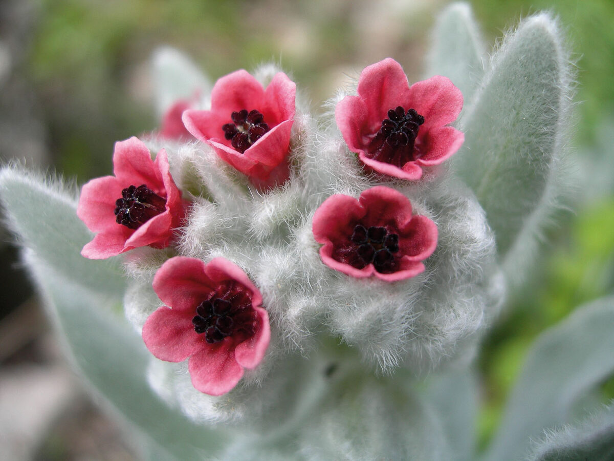 Uni o multicaule, densamente serícea. Hojas inferiores hasta 10(13) x 2(3) cm, oblanceoladas o elípticas, las medias y superiores hasta 7 x 1,5 cm, oblanceoladas, oblongas u ovado–oblongas. Cimas bracteadas. Flores actinomorfas, hermafroditas, pentámeras. Cáliz dividido casi hasta la base, con lóbulos de 3,5–9 mm en la floración, marcadamente acrescentes en la fructificación. Corola con tubo de 3–6,5 mm, cilíndrico, y limbo de 3–6,5 mm de diámetro, rojizo, rojizo–pálido casi rosado, rojo–purpúreo o amarillo–crema, con 5 apéndices cerrando la garganta y estambres insertos por encima de la mitad del tubo de la corola, rara vez en su parte superior. Núculas 3–7 x 5,5–7 mm, anchamente ovoideas, de dorso convexo, plano o cóncavo, densa y uniformemente gloquidiado, con margen o sin margen marcado