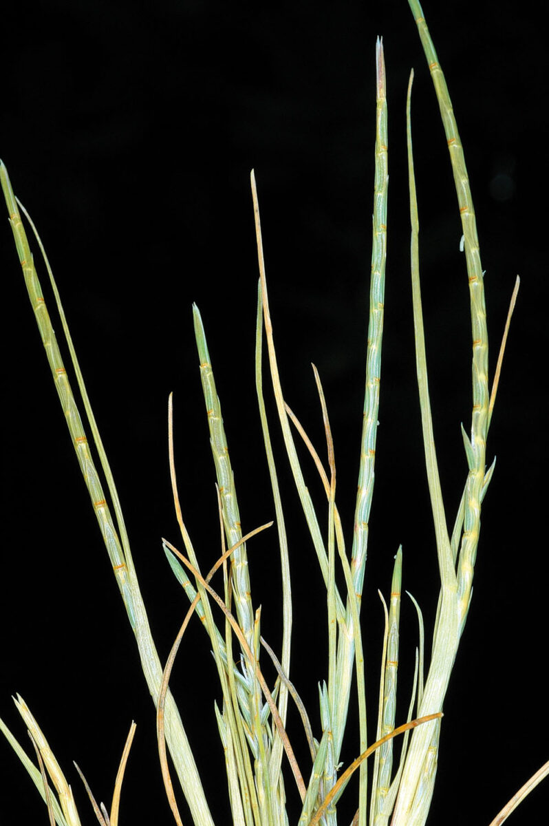 Lámina de las hojas hasta 8 cm x 1–1,5 mm, conduplicada; lígula 0,5–1 mm, truncada, membranácea. Espiga hasta 14 cm, que se desarticula en la madurez, generalmente recurvada, con excavaciones en el raquis donde se alojan las espiguillas. Espiguillas hasta 6 mm, unifloras, comprimidas dorsalmente; glumas hasta 6 mm, más largas que la flor, iguales, con 5 nervios, de quilla no alada, coriáceas, con surco transversal en la base; lema 3–4,5 mm, trinervado; pálea tan larga como el lema. Anteras 0,4–0,9 mm