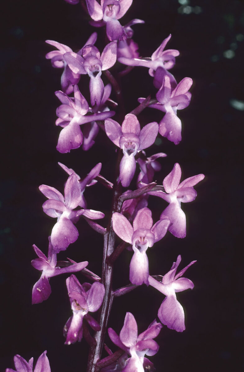 Tubérculos 2, indivisos, sésiles o subsésiles. Hojas basales 5,5–11 x 1–2 cm, formando roseta, oblongo–lanceoladas, agudas, generalmente con manchas violáceas. Inflorescencia 7–16 cm, subcilíndrica, laxa; brácteas inferiores algo más cortas o más largas que el ovario, con 1–3 nervios, lanceoladas, agudas, membranáceas, violáceas. Flores sésiles, rosadas o violáceas. Sépalos laterales libres, de patentes a erectos. Pétalos laterales lanceolados, obtusos. Labelo 9–12,5 x 8–15 mm, trilobulado, geniculado en la línea media, con la parte inferior en distinto plano que la superior, con la zona central blanquecina o con numerosas manchas violáceas usualmente ordenadas en 2 filas; lóbulos laterales curvados hacia el pedicelo; espolón 8–13 x 1–3 mm, cilíndrico, obtuso, arqueado hacia arriba. Fruto cápsula, erecto, con 6 costillas