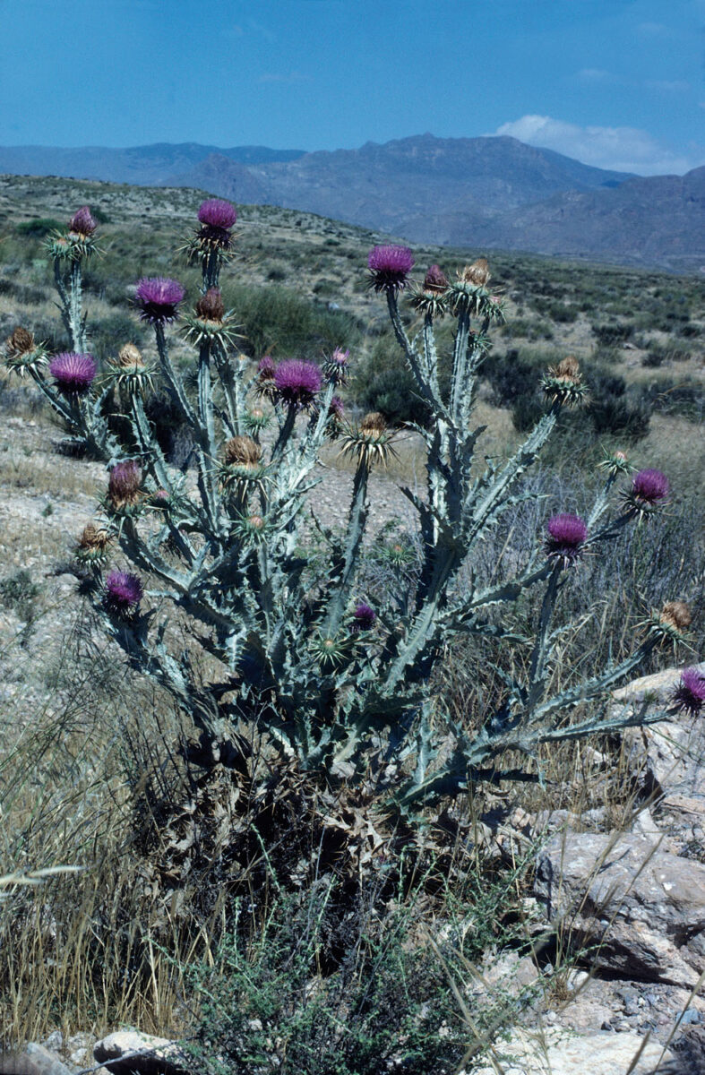 Ramificada, verdosa o blanco–grisácea. Hojas caulinares de lanceoladas a elípticas, pinnatipartidas o pinnatífidas, rara vez pinnatisectas, espinosas, aracnoideas, con indumento oculto de glándulas globulares y pelos pluricelulares. Capítulos formando conflorescencias racemosas o subcorimbosas; involucro 2,5–6,3 x 3–10 cm, con numerosas filas de brácteas imbricadas, aplanadas, las externas y medias patentes o reflejas, con espina terminal, de márgenes serrulados, coriáceas, las externas de 10–34 x (2)4–9 mm, triangular–lanceoladas, glabras, las medias de (14)18–34 x 5–9 mm, semejantes a las externas; receptáculo glabro, foveolado. Flores flosculosas, rosado–violáceas; corola 28–42 mm, con limbo de longitud < que la del tubo, glanduloso. Aquenios 4,5–6 mm, obovoideos; vilano 8–16 mm, de escábrido a subplumoso, blanquecino o rosado