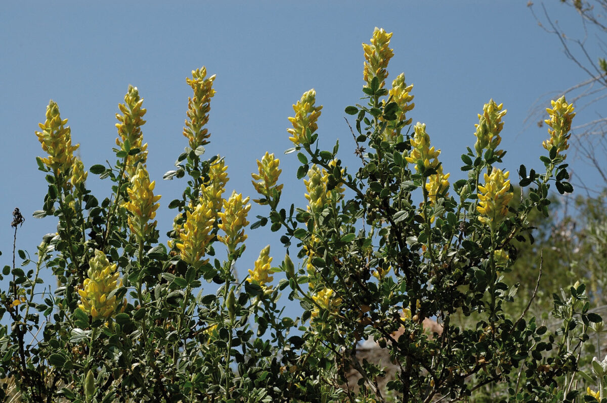 Tallos puberulento–glandulosos, los viejos a veces con pelos eglandulíferos. Hojas alternas, estipuladas, trifolioladas, las de la inflorescencia reducidas a las estípulas; folíolos (7)10–35 x 4–25 mm, ovados, obovados u oblongo–elípticos, serrados, glabros o con glándulas sentadas. Flores hermafroditas, zigomorfas, pentámeras, pediceladas, en racimos terminales subespiciformes, densos. Cáliz 8–12 mm, campanulado, con pelos glandulíferos y eglandulíferos; dientes 4,5–9 mm, lanceolados o linear–lanceolados. Corola 11–18 mm, hasta 1,5 veces más larga que el cáliz, papilionada, predominantemente amarilla, con estandarte glabro. Androceo monadelfo. Legumbre 6–7,5 mm, ovoidea, inclusa, pubescente, con 1–2 semillas. Semillas c. 3 mm, ± orbiculares, lisas, pardas u oliváceas