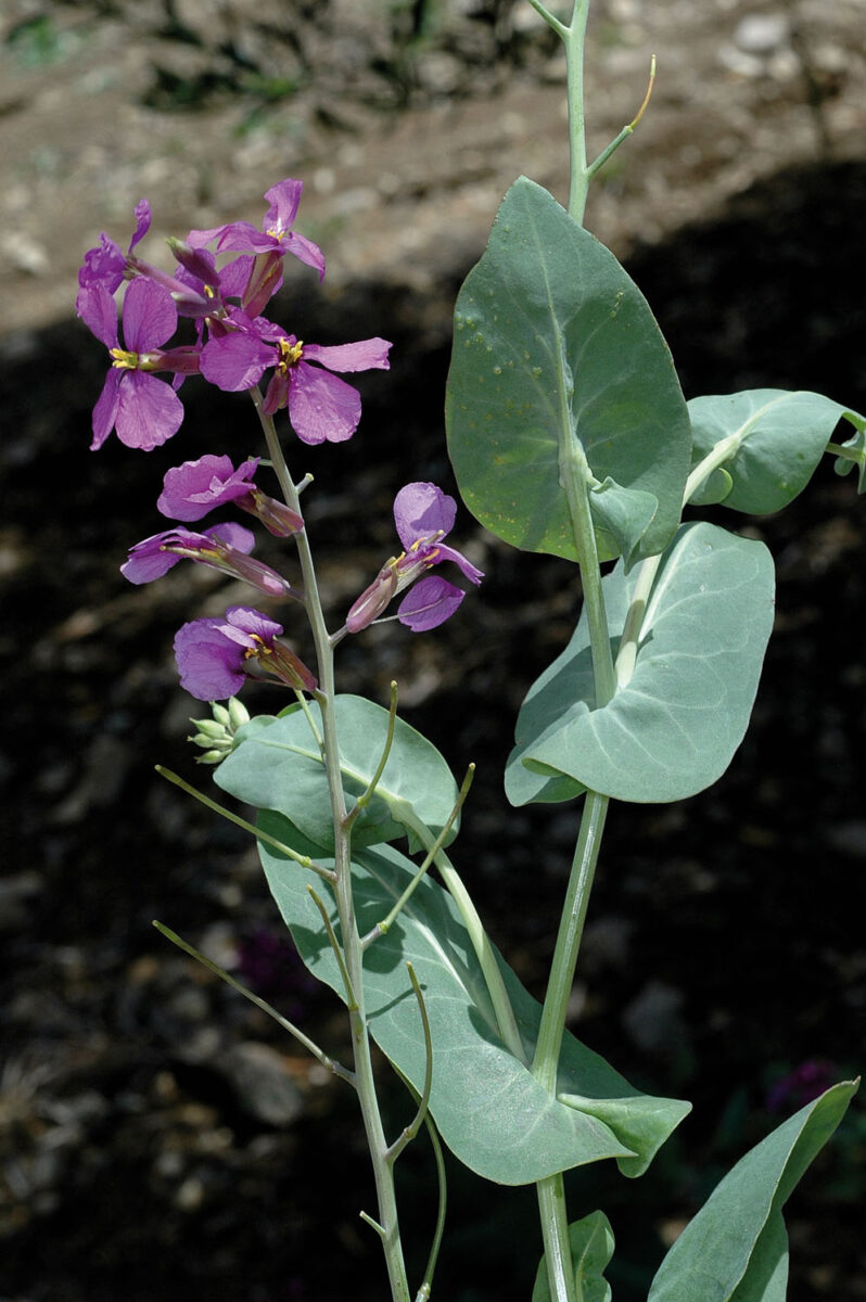 Tallos con base algo leñosa, ramificados en el tercio inferior, glabros. Hojas basales 2–7,5 x 0,7–5 cm, de obovadas a espatu-ladas, enteras o ligeramente crenadas, algo crasas, pruinosas, glaucas; las caulinares más pequeñas, cordado–amplexicaules, oblongas, ovales u ovadas, de ápice obtuso o agudo. Racimos ebracteados, laxos, con 8–20 flores. Flores actinomorfas, hermafroditas, tetrámeras; sépalos 8–12 mm, erectos, los laterales gibosos en la base, los medianos ligera-mente cuculados en el ápice, con tintes lilacinos; pétalos 20–22 mm, unguiculados, de limbo erecto–patente, obovado, de lilas a malvas, a veces blanquecinos; estambres 6, tetradínamos. Frutos en silicua, de 30–75 x 2–3(4) mm, lineares, rectos, comprimidos, erecto–patentes. Semillas 1,2–1,5 x 1–1,2 mm, biseriadas o subseriadas, elipsoidales, pardas