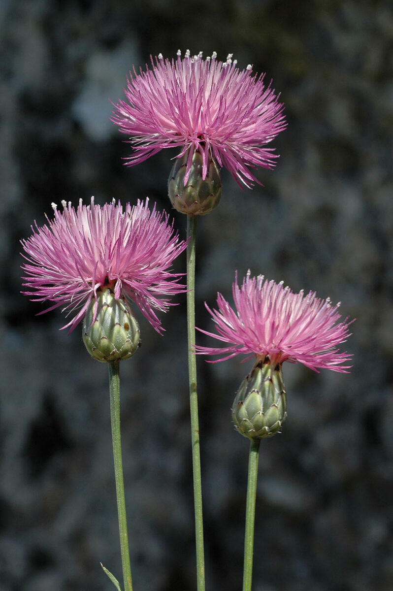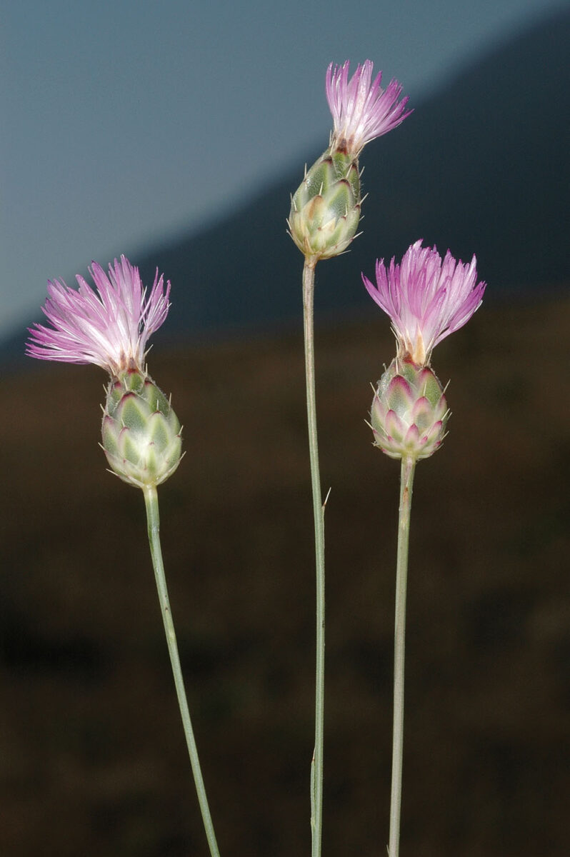 Vivaz, multicaule. Hojas basales pecioladas, pinnatipartidas o pinnatisectas, pelosas; las caulinares alternas, sésiles, lineares o lanceoladas, enteras o dentadas, glabras. Capítulos terminales, solitarios, pedunculados; involucro 12–19 x 7–15 mm, ovoideo o subgloboso, con varias filas de brácteas imbricadas, coriáceas, las externas y medias ovadas, de ápice oscuro, terminado en una espina de 0,5–1 mm de erecta a refleja, caduca; receptáculo peloso. Flores flosculosas, purpúreas, a veces blancas, las externas neutras. Aquenios 3,5–4,5 mm, oblongo–obovoideos, con corónula apical y costillas poco marcadas, algo rugosos; vilano 2,5–4 mm, de varias filas de pelos paleáceos, denticulados