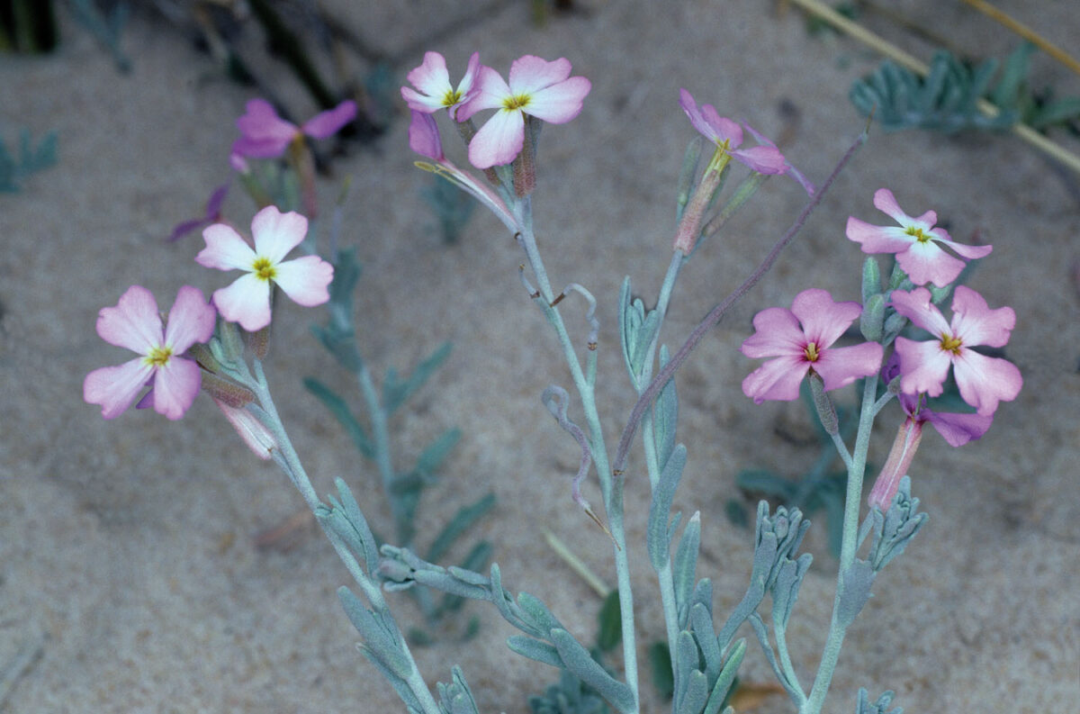 Planta blanquecina, de base leñosa; indumento denso de pelos ramificados, con numerosos radios. Tallos ramificados, ascendentes o suberectos. Hojas 10–50 x 1,5–14 mm, alternas, sésiles, linear–oblongas, enteras o sinuado–dentadas, en ocasiones algunas pinnatífidas o pinnatipartidas, a veces con el margen revuelto, de ápice redondeado a obtuso. Racimos con 5–20 flores, ebracteados, laxos. Flores actinomorfas, hermafroditas, tetrámeras; sépalos 8–13 mm, erectos, los laterales gibosos en la base, linear–lanceolados, agudos, tomentosos, de margen membranáceo; pétalos 17–27 mm, unguiculados, de limbo patente, obovado–triangular, emarginado, rosado o lila; estambres 6, tetradínamos. Frutos en silicua, de 25–65 x 1–1,2 mm, lineares, de sección circular, erecto–patentes, en ocasiones flexuosos, torulosos; pedicelo 5–15 x c. 1 mm, tan ancho como el fruto; pico 5–6 mm, subulado. Semillas uniseriadas